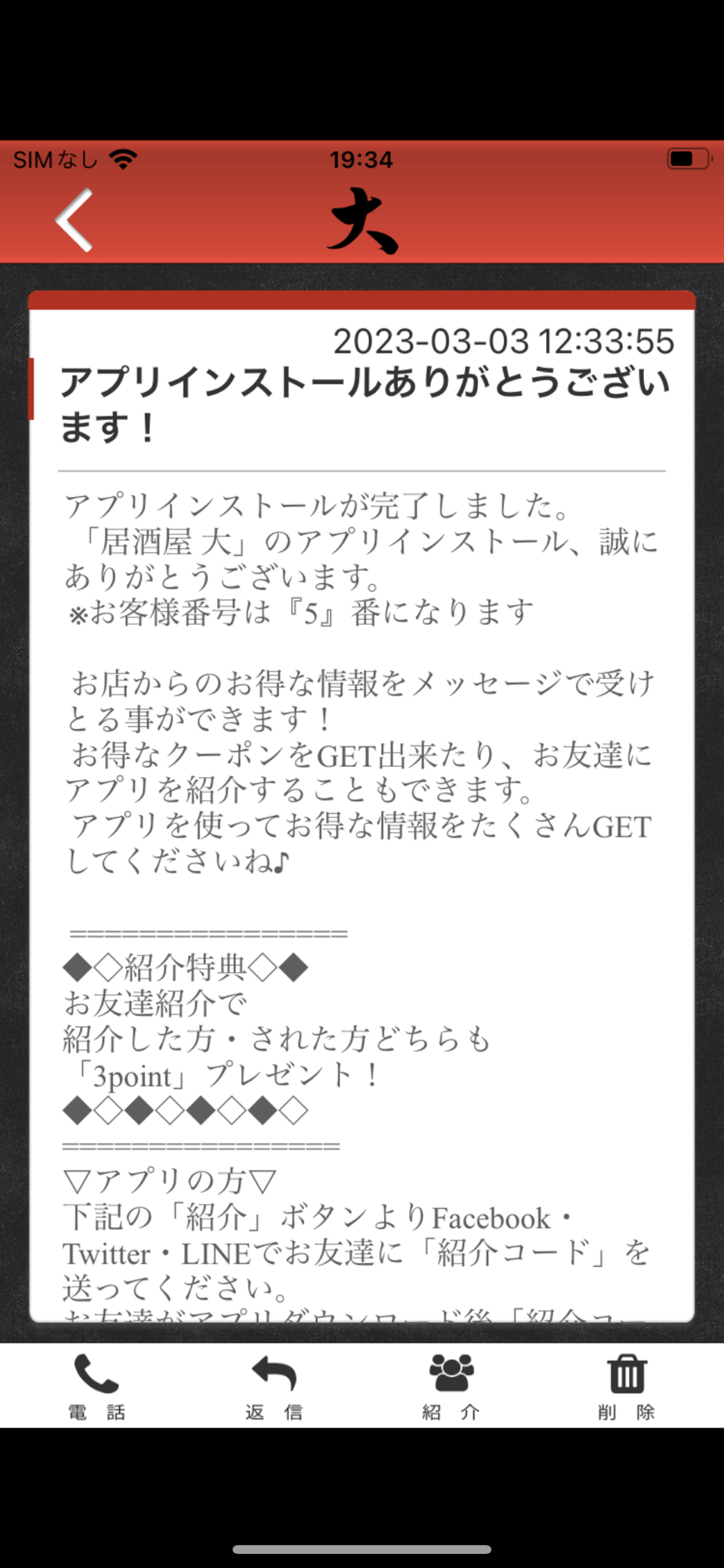 居酒屋 大のアプリをSNSを通じてお友達に紹介する事ができます。