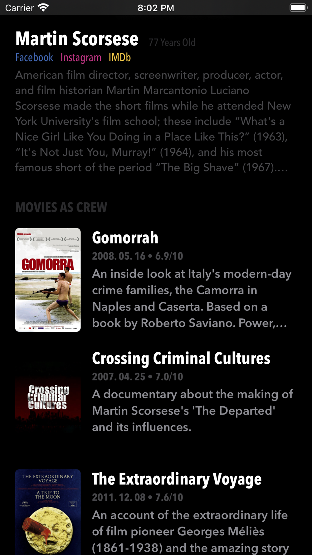- Get to know the person informations behind a movie, like images, age, biography, movies he/she worked as crew or cast
