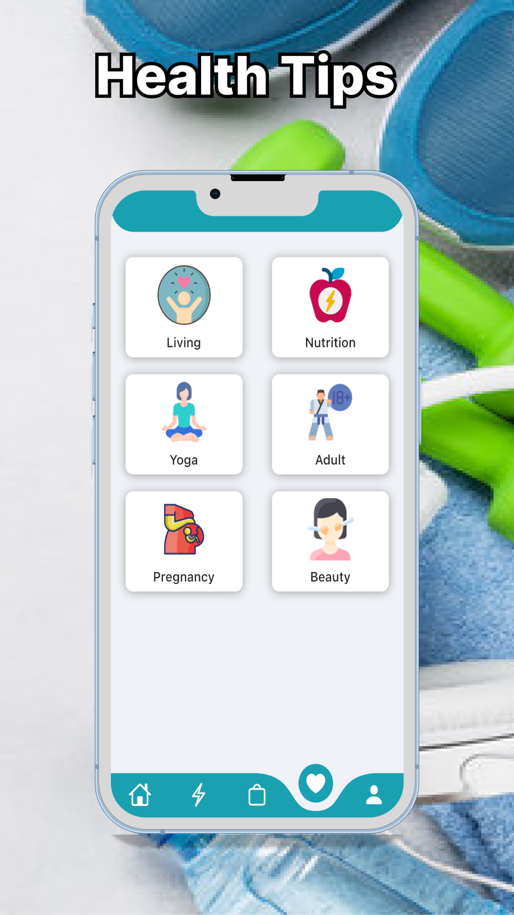 There is a health tab in the app that features important tips regarding Living Style, Nutrition, Yoga, Adult tips, Pregnancy Guide, and Beauty tips.