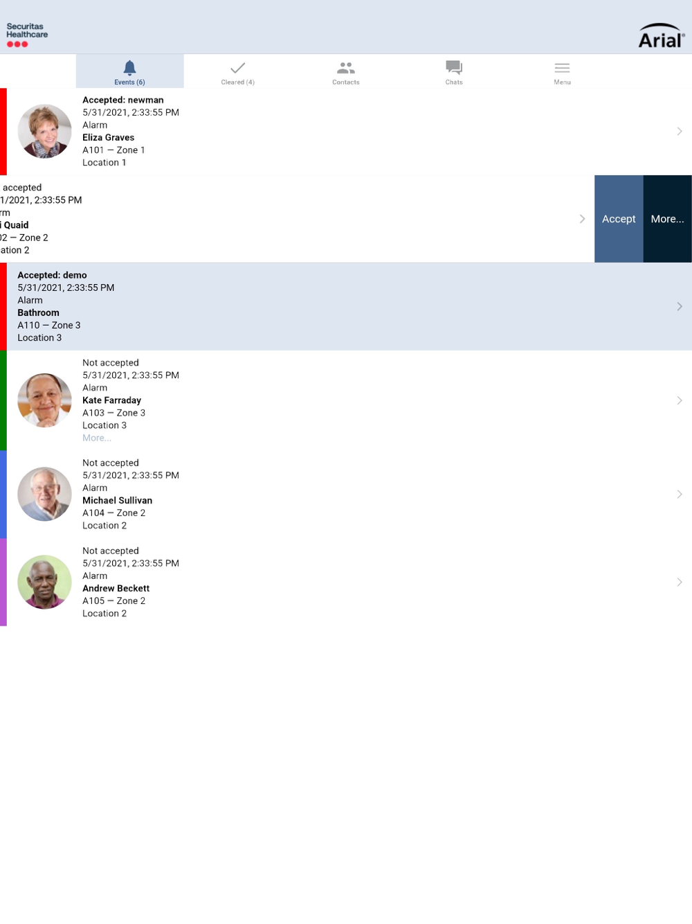 The Arial® Mobile Application has been designed to work seamlessly with STANLEY Healthcare’s Arial® Wireless Emergency Call System to provide senior living caregivers with an innovative tool for handling emergency call alarms and communicating collaboratively with their coworkers. The Arial® Mobile Application is packed with intuitive features to ensure community caregivers have visibility to all relevant alarms, their status and who is responding.