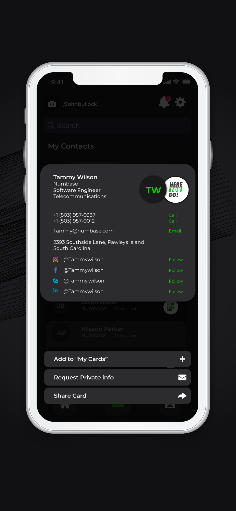 • Share your card's link (hereyougo.com/yourname) easily across any platform or use it as your email signature