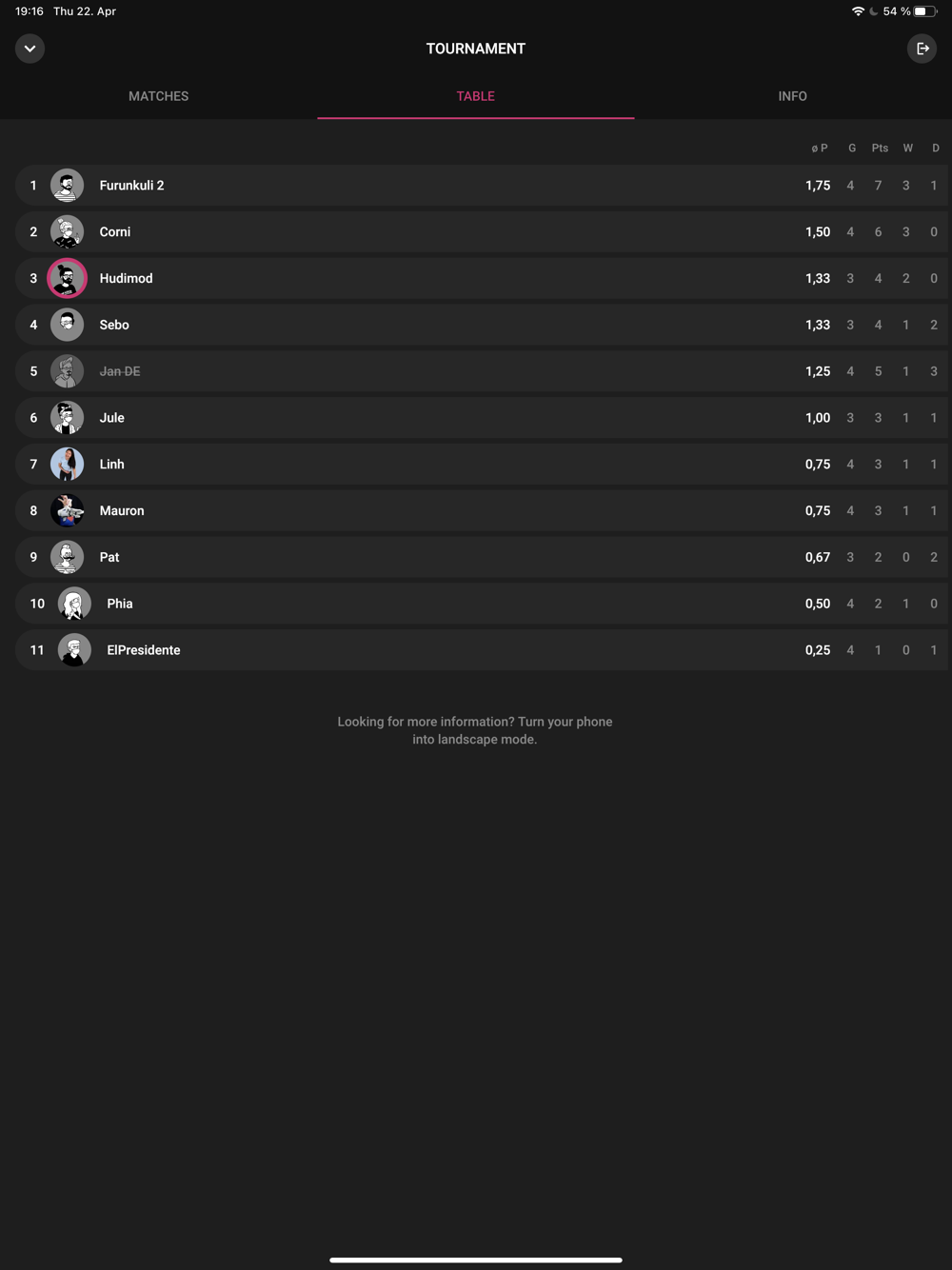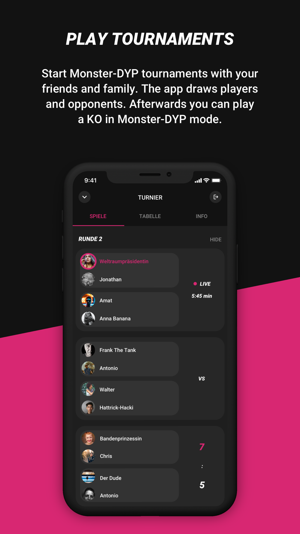 Start a tournament and let other players participate by scanning a QR code. The game is played in the socially acceptable Monster-DYP mode. The beginner-friendly mode draws new players and opponents every round, taking into account that the skill level of the teams is balanced. Afterwards, an elimination round can be played: Also here in monster-DYP mode: Your partner changes every round!