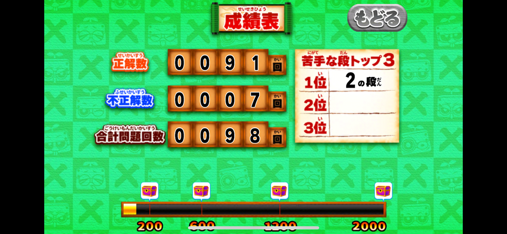 成績表機能で、お子さんの正解数、不正解数、苦手な段を確認できるので、目標や課題が一目で把握できます。学校での学習サポートや、復習にも活用。