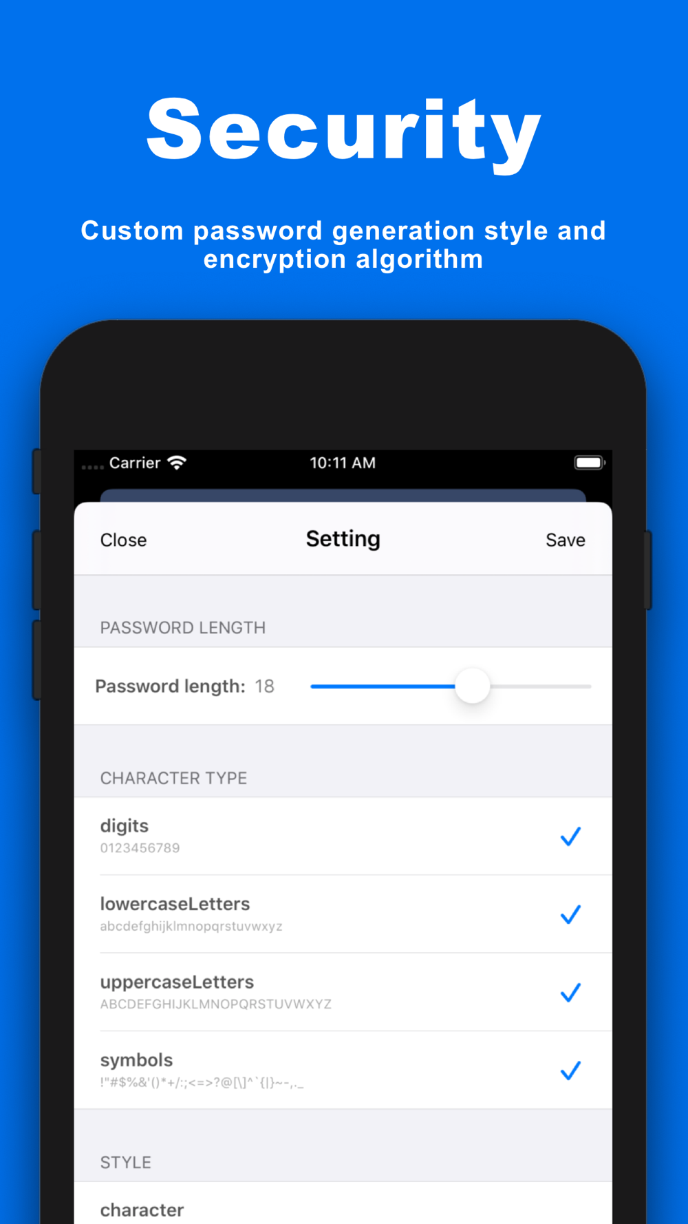 - Password character set: numbers, uppercase letters, lowercase letters, symbols