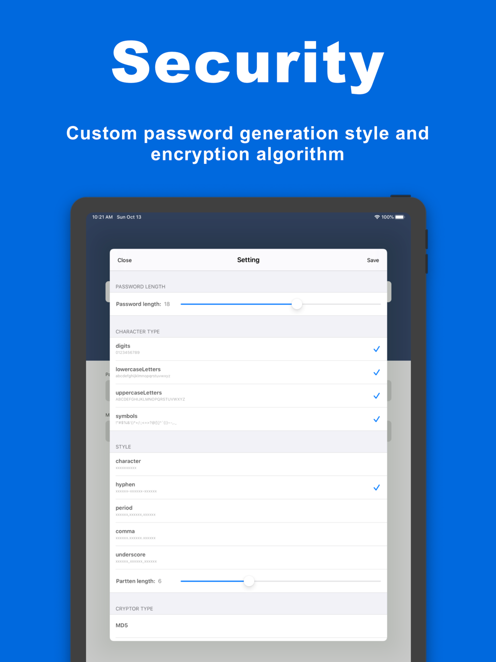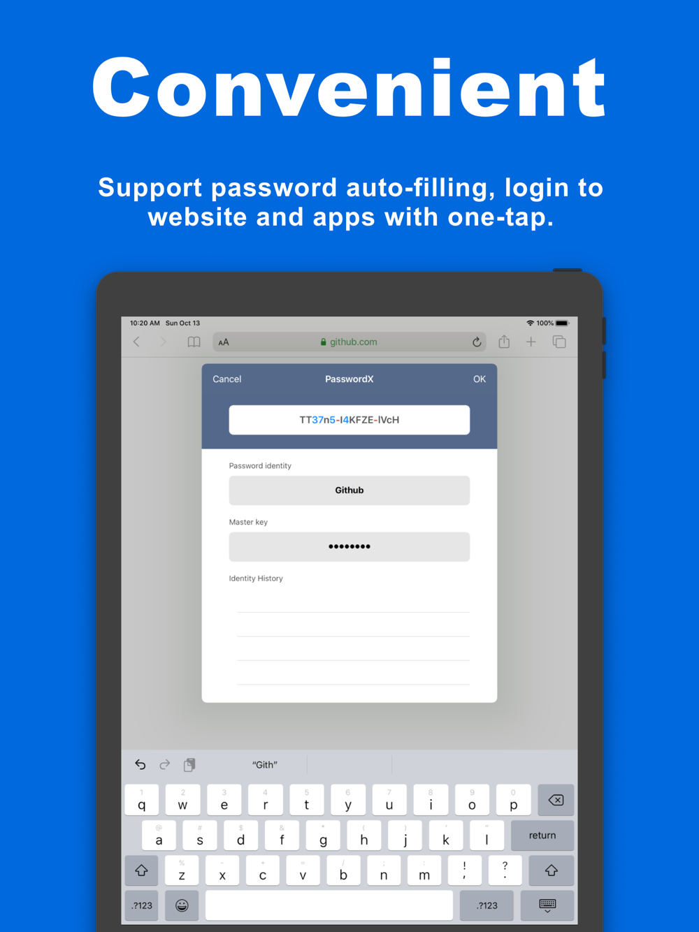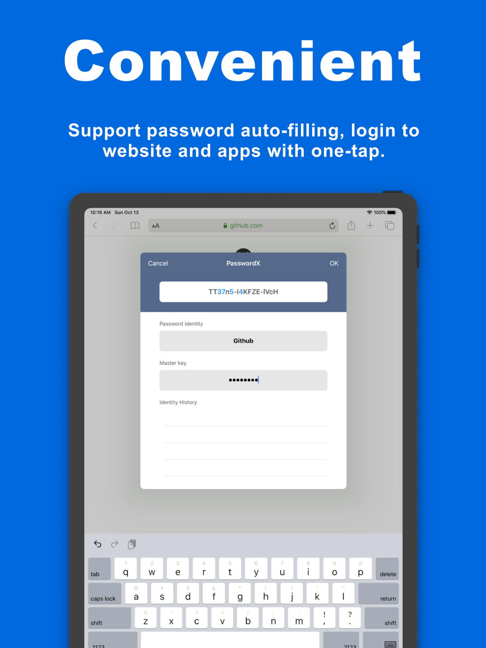 PasswordX is an offline password generator. You can generate strong passwords with password mnemonics and master passwords and your own password generation rules. No cloud services, no internet, as long as you have installed this app. You can get your password on either Mac or iOS. PasswordX also supports password auto-filling on iOS, you can use PasswordX more conveniently on web pages and other apps.