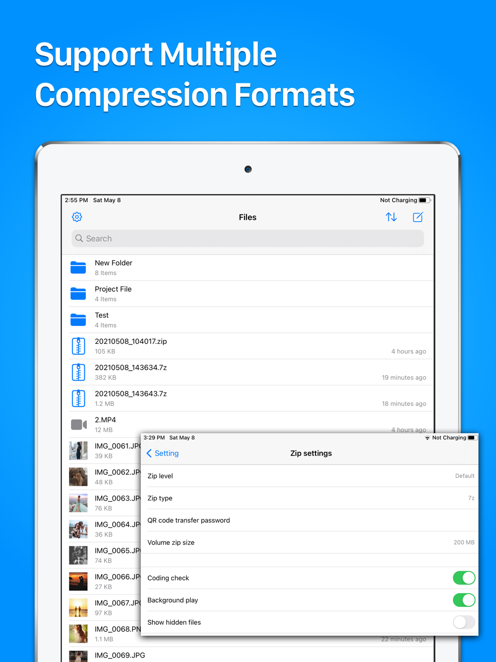 We support importing and exporting files, and can directly compress photo and video of albums.
