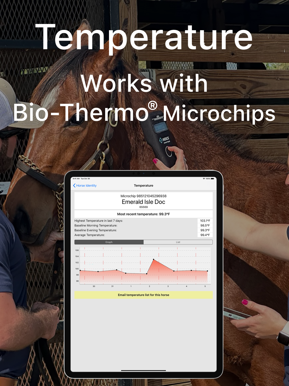 When paired with the Bio-Thermo™ microchip, the EquiTrace app will display microchip temperature and display it on an easy to read graph that rapidly highlights temperature spikes.