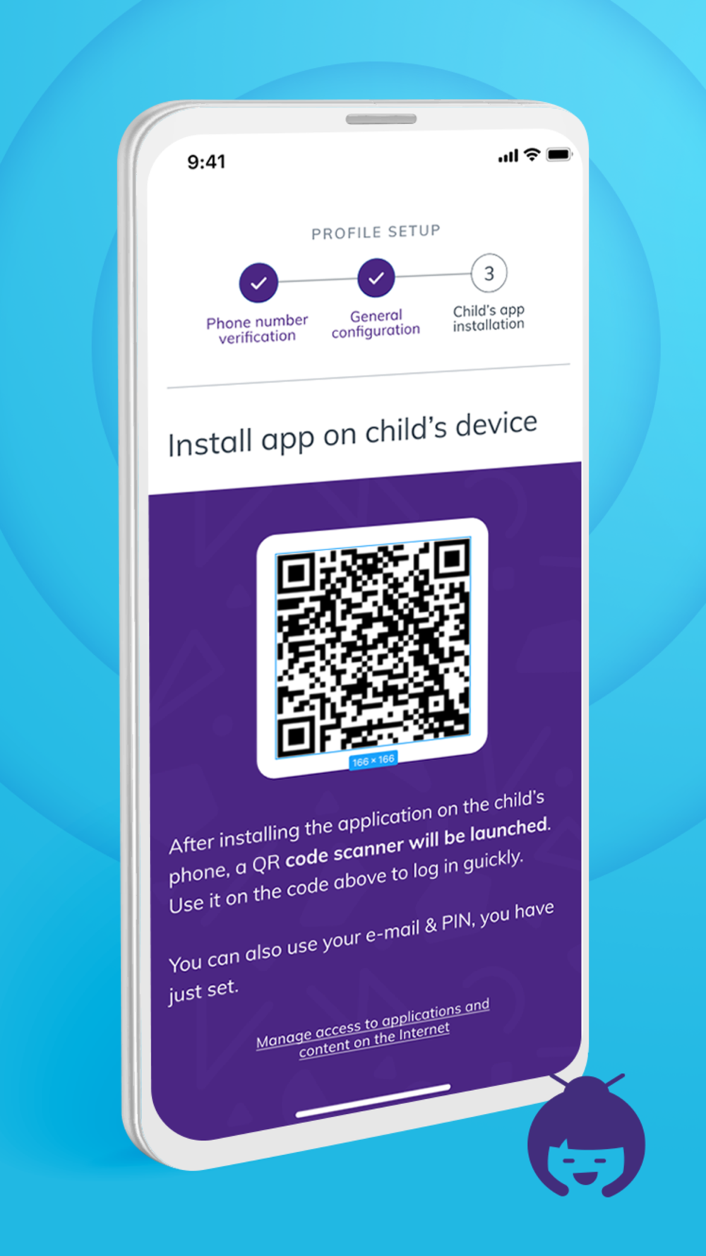 The guardian and the child install the same application on their devices. The guardian sets up his account in the application and then logs in to it on the child's device (or the child independently pairs with it using the QR code).