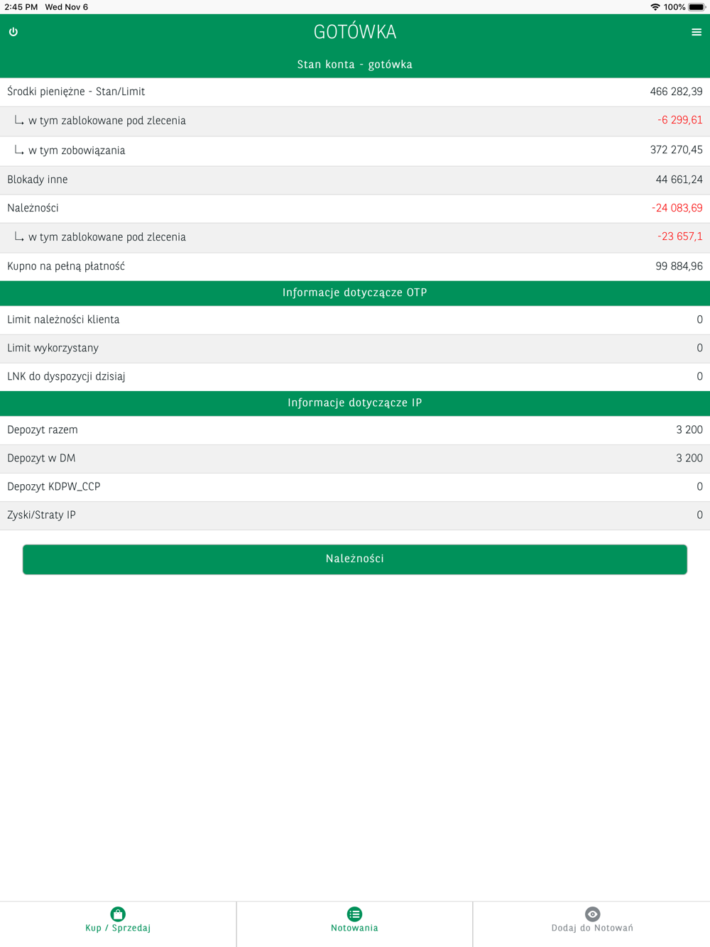 Możesz zapoznać się ze stanem rachunku w każdej chwili - na jeden gest. Jako pierwsze opcje w menu umieściliśmy przyciski do przeglądu stanu gotówki oraz instrumentów finansowych. Kliknięcie w przycisk „Gotówka” pozwala na szczegółowy przegląd środków finansowych. U góry zawsze znajduje się łączna wartość środków pieniężnych wraz ze szczegółami dotyczącymi ich bieżącego zaangażowania. Ponadto możesz sprawdzić wartość dostępnych limitów odroczonej płatności w ramach podpisanej umowy czy wartość środków pieniężnych zaangażowanych w depozyt zabezpieczający pozycję w instrumentach pochodnych. Pozycja „Papiery” umożliwia przegląd ogólnego stanu instrumentów finansowych, zaś wybranie konkretnego instrumentu pozwala zapoznać się z jego szczegółami oraz złożyć zlecenia sprzedaży czy obejrzeć bieżące notowania.