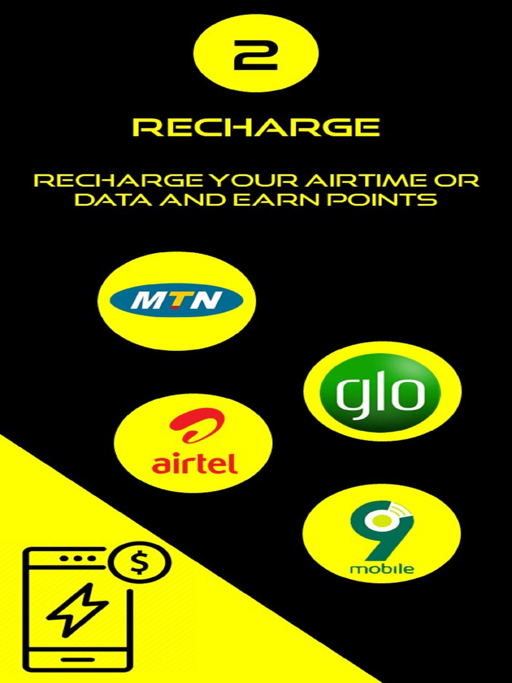 2. Recharge your airtime and data, for MTN and Glo, on our app, to earn points and save up these points to meet a specific Target Points.