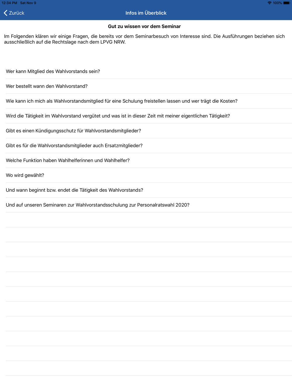 Mit der App haben Sie zudem einen jeweils aktuellen Überblick über die Termine und Orte der von uns angebotenen Wahlvorstandsseminare, inklusive Anmeldestand sowie einen Überblick über die Termine und Orte der beiden Grundlagenschulungen PR I und PR II für einen guten Start in die Amtszeit nach der Wahl.