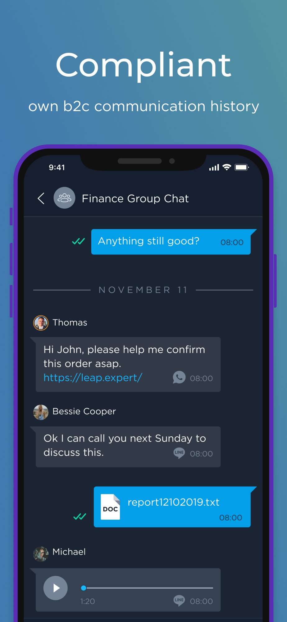 Leap Work is a B2C communication app. Employees can call or send text, voice and file messages to client's messengers of their choice: WhatsApp ™, WeChat ™ , Telegram ™ , Line ™ and others. Leap Work is a part of LeapXpert’s Federated Messaging Orchestration Platform (FMOP). FMOP concept allows the promotion of messaging to a formal business communication channel, similar to calling or emailing.
