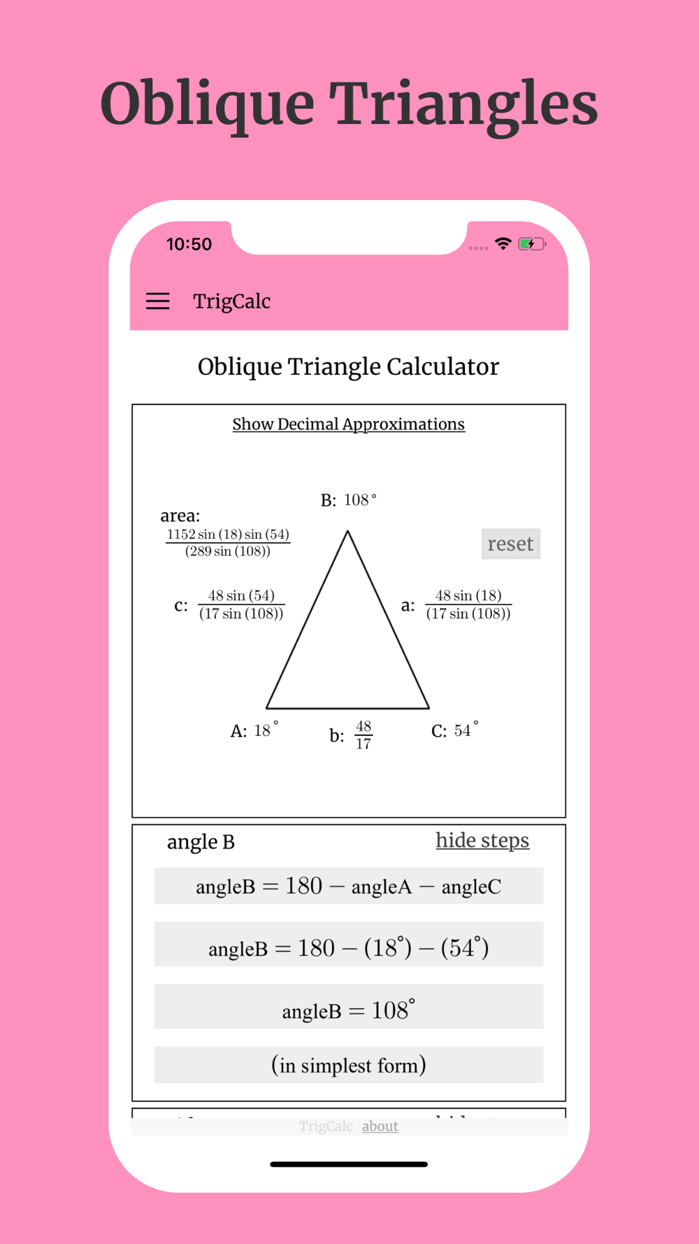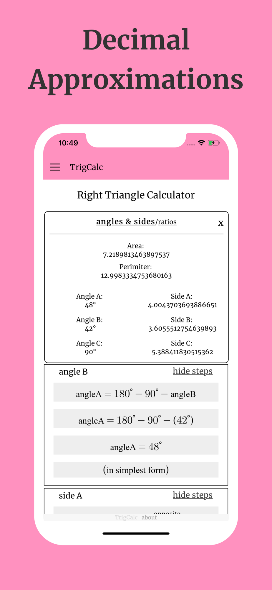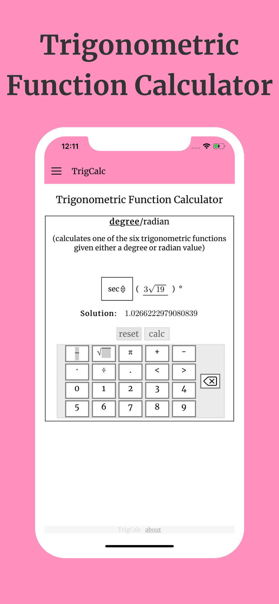 Trigcalc aims to make trigonometry calculations as simple yet detailed as possible. Trigcalc provides step-by-step solutions to some of the most common trigonometry and geometry problems. Trigcalc also uses real math notation such as radicals, exponents, fractions, pi, and more. The list of supported calculators are shown below: