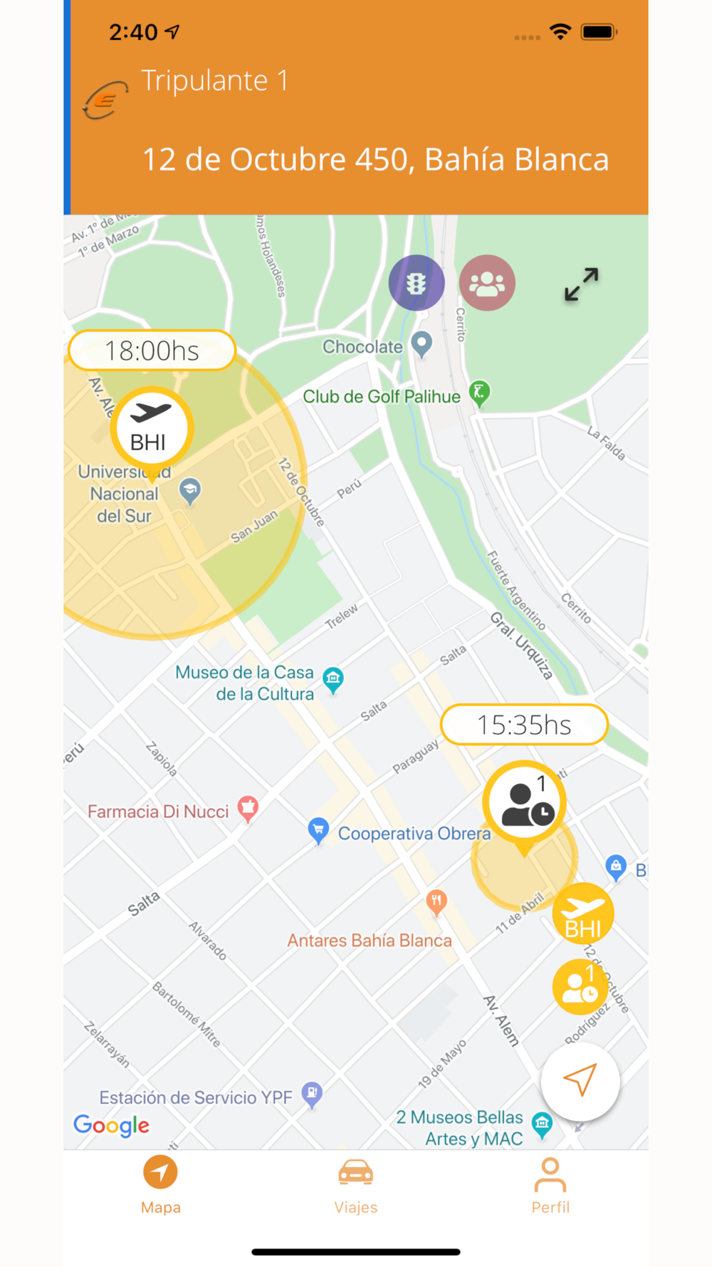Con rol de chofer, se reciben notificaciones con la información de los tripulantes que hay que pasar a buscar para llevar al aeropuerto junto con las restricciones de horario, y se realiza un seguimiento del progreso del viaje basado en la geoposición del chofer y del domicilio del tripulante en cuestión.