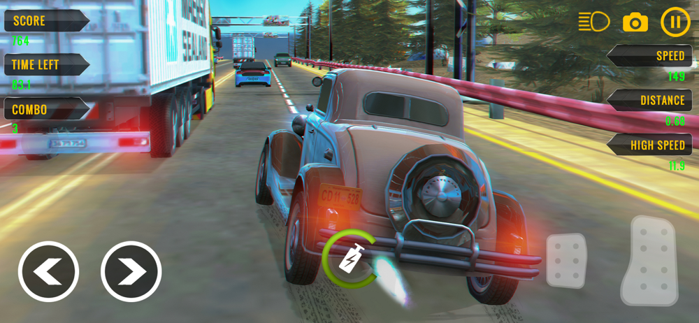 - When driving over 100 kmph, overtake cars closely to get bonus scores and cash