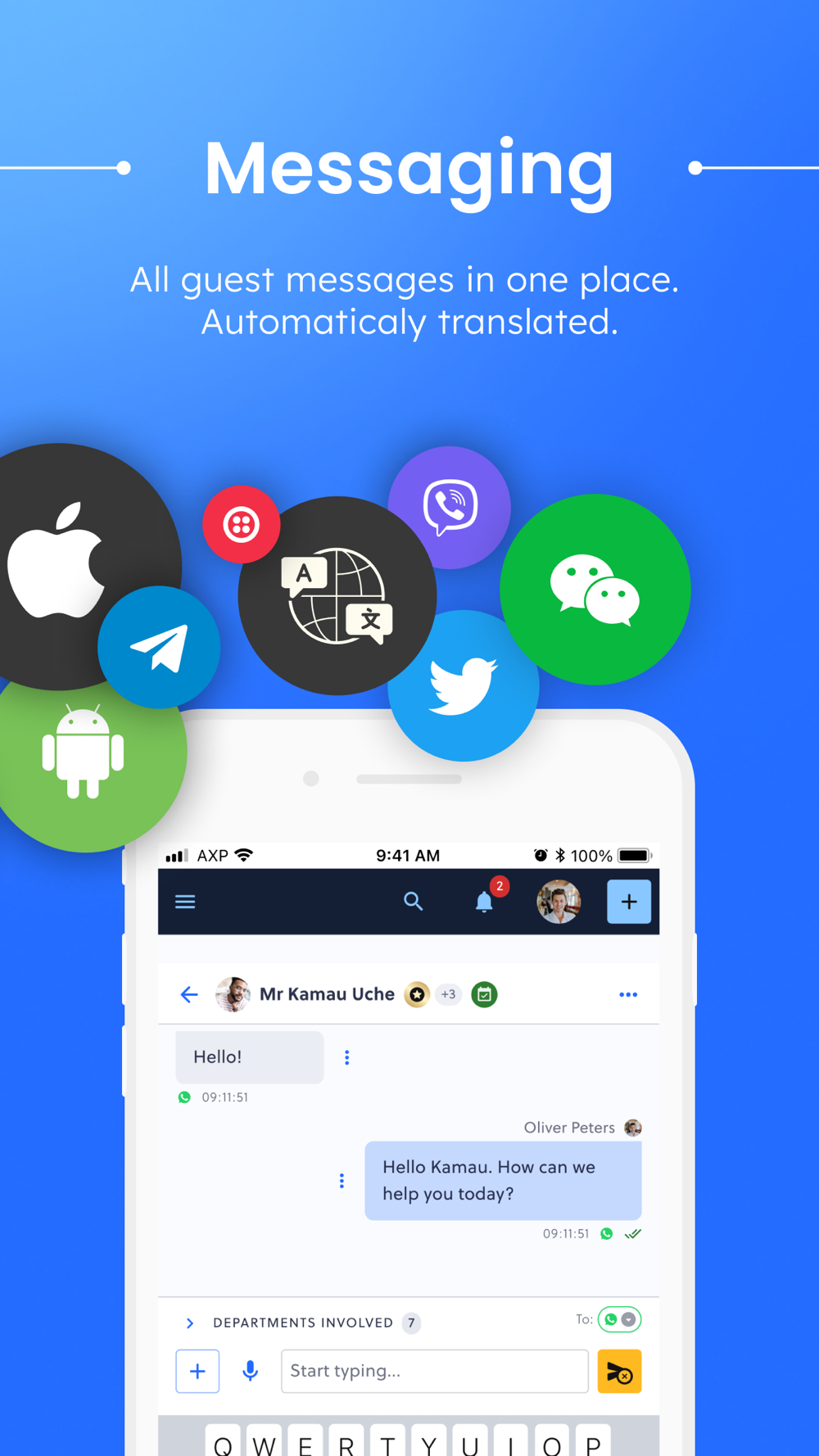 Powering hotels in over 46 countries, this single interface with automatic translation allows your guests to connect with you in the language and app of their choice including WhatsApp, WeChat, FB Messenger, LINE, SMS, in your hotel's app and many more.