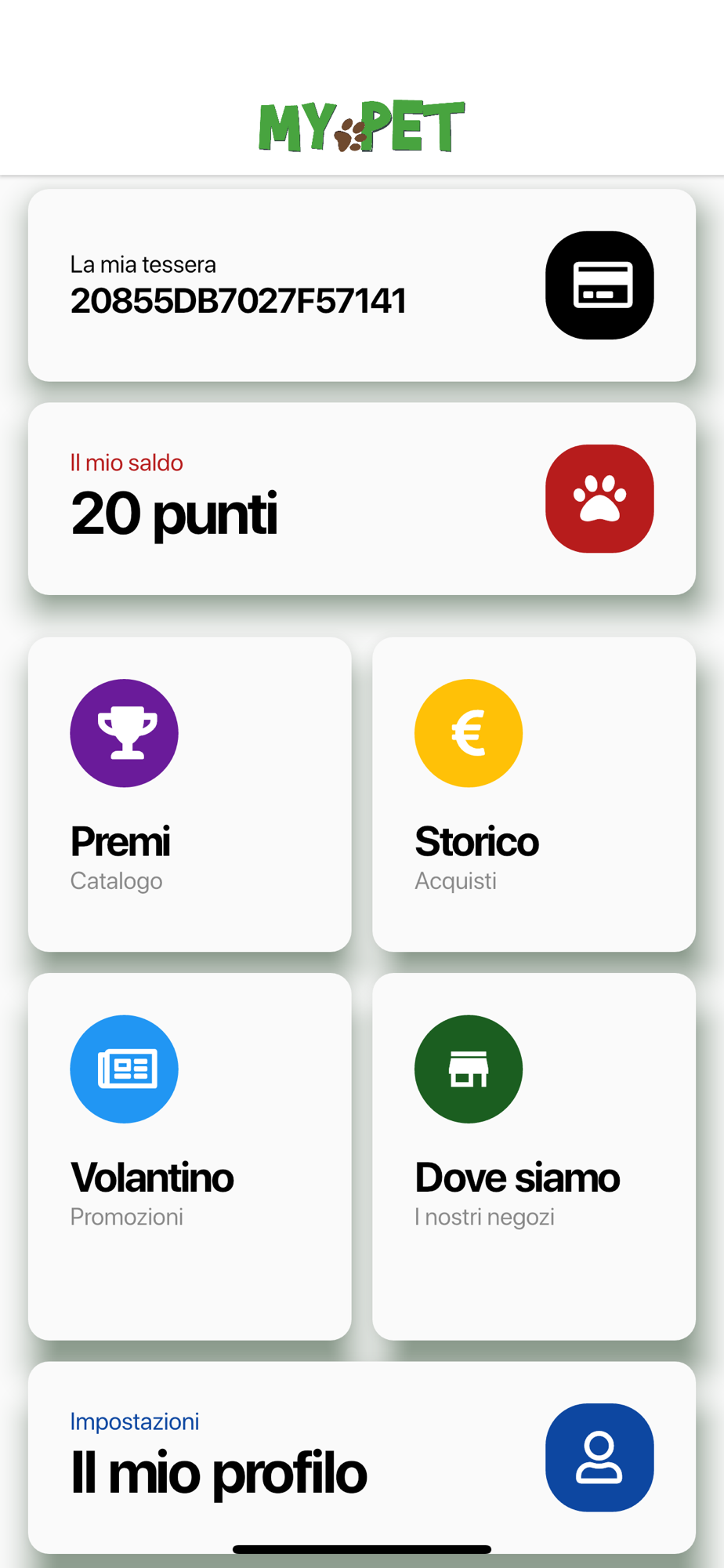 Con la app ufficiale di My Pet potrai avere sempre a portata di smartphone la tua tessera fedeltà, oltre a poter consultare in ogni momento il tuo saldo punti e i tuoi acquisti passati.