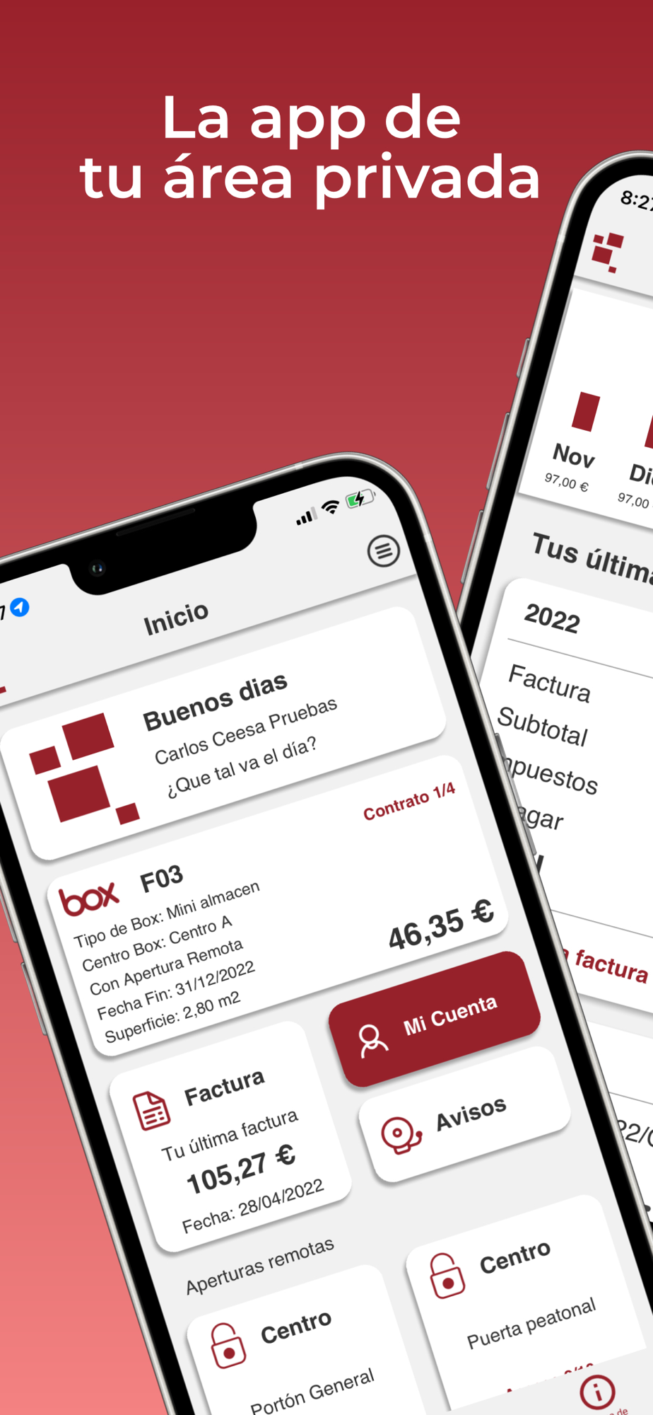 Con All Box app podrás acceder a toda la información al respecto del alquiler de tu trastero, como consultar tus contratos de alquiler de trasteros o tu última factura; recibir o enviar avisos a tu centro de Self Storage; o realizar la apertura de accesos y alarmas, tanto de zonas comunes como privadas, desde tu smartphone.
