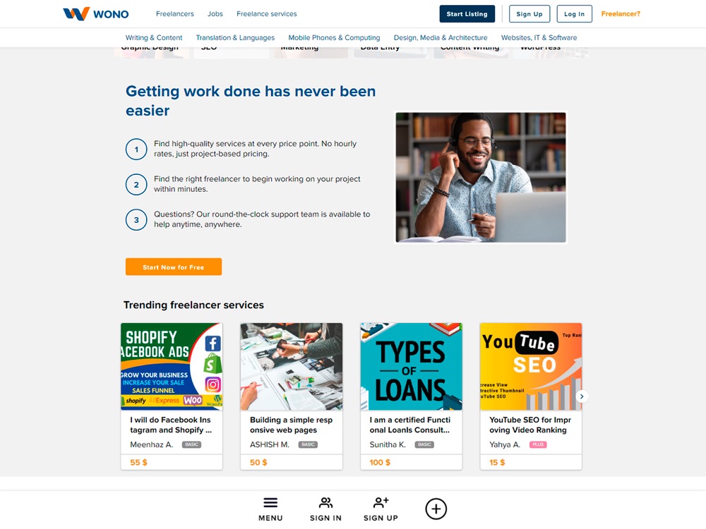 Wono is a All-in-one solution for freelancers, freelance services and jobs with lower commissions for freelancers and their customers.