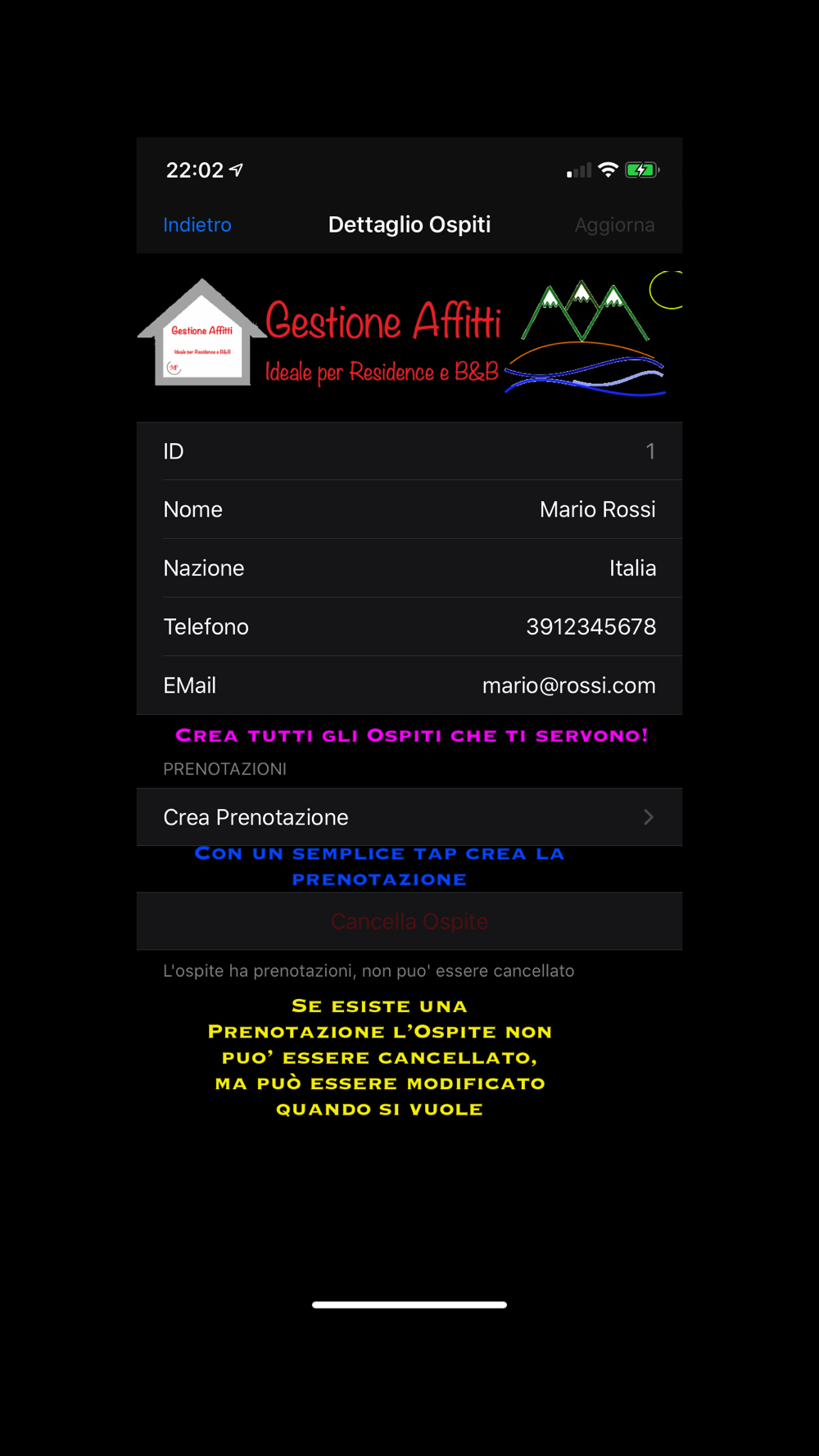 - Per gli Ospiti e' possibile salvare il nome, la nazionalità, un numero di telefono e una eMail.