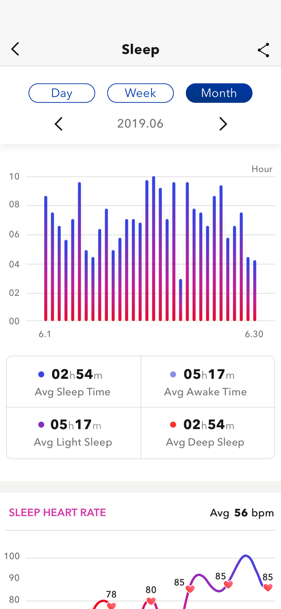 Records detailed daily sleep status including deep sleep, light sleep, and sleeping heart rate.