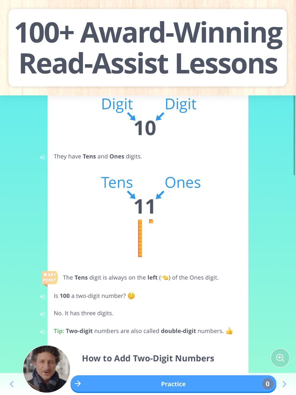 • 100+ award-winning ‘read-along’ lessons written for kids.