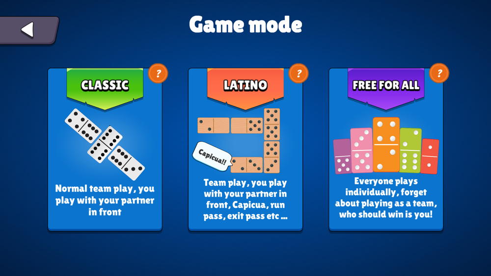 In offline, you can play domino in classic, Latin or Free For All mode. In multiplayer, you can play in classic and Latin modes with your friends or random players.