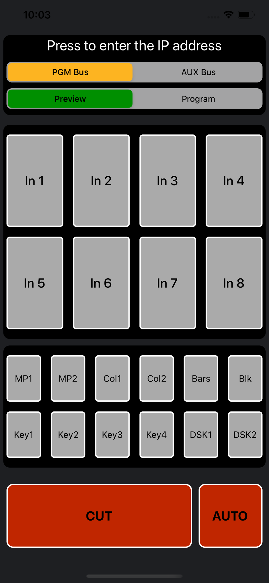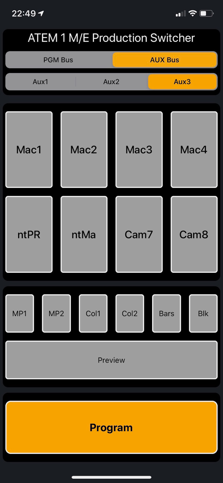 This app is designed to remotely control the BlackMagic ATEM, switch sources to a "Program", "Preview" or "Aux bus", directly from your device via a network connection.