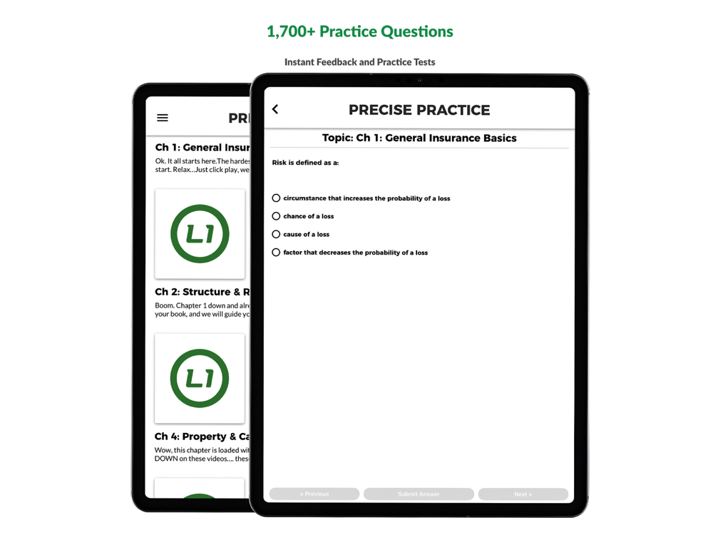 1,700+ Questions. With thousands of questions in our question bank, you can put your brain to the test. 500+ Flashcards. Test yourself on the go. Our course has more interactive flashcards than any other resource on the market and covers key concepts from every section on the exam. 6+ hrs of Video. Excellent interactive learning through HD, on-demand videos. Get a truly interactive learning experience with videos and whiteboard sessions right inside the course. We'll guide you through the study material in a fun atmosphere that feels like you are learning from a personal tutor at Starbucks. 3 Mock Exams: Test yourself with 3 different levels of Mock Exams that mimic the real Property & Casualty Exam. Track your progress. Stay on track with your study plan with your personal dashboard tracking your flashcards, videos, and test question progress.