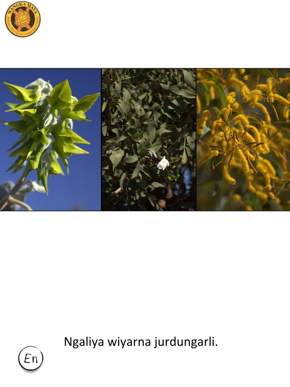 The stories contained within this book were first recorded in 2009 by Banyjima Elder Kathleen Hubert with the help of linguist Eleanora Deak. Kathleen created the stories for her children and grandchildren, to help keep their language skills strong. The stories were originally published as five separate booklets and made available to Kathleen’s family. In 2014 Kathleen generously gave Wangka Maya Pilbara Aboriginal Language Centre permission to publish the stories and make them available to the wider community. This second edition was compiled by Annie Edwards-Cameron as part of the 2014 IBN Language Project. Many thanks are due to Kathleen’s daughters May Byrne and Karen Hubert and granddaughter Dolly for their permission to reproduce their photos in these stories. Thanks also are due to staff at Karlarra House for their support.