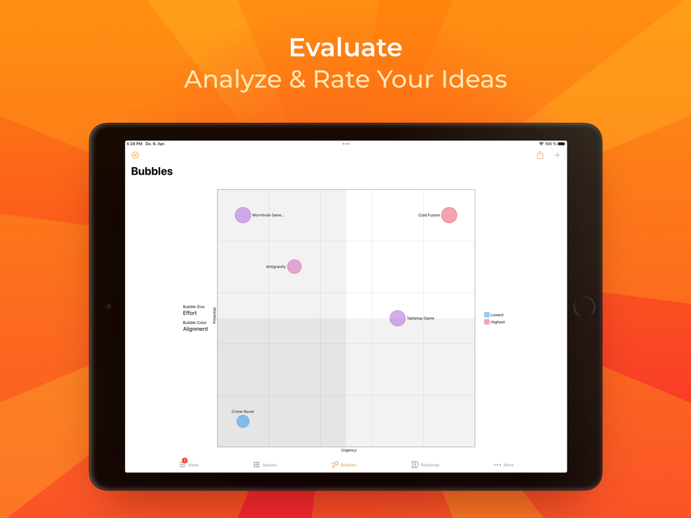 - Unique "Bubbles" view for analyzing ideas using customizable bubble charts in four dimensions (x, y, bubble size and color)