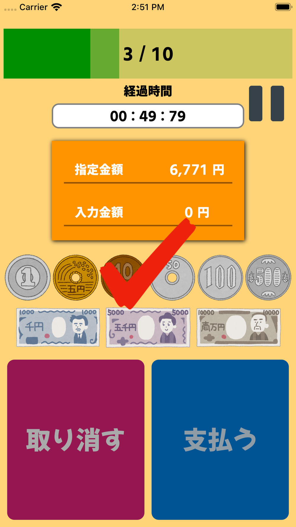 ・[指定金額]欄に表示されている金額と同じ額のお金をタップし、[支払う]をタップすると次の問題に進めます。