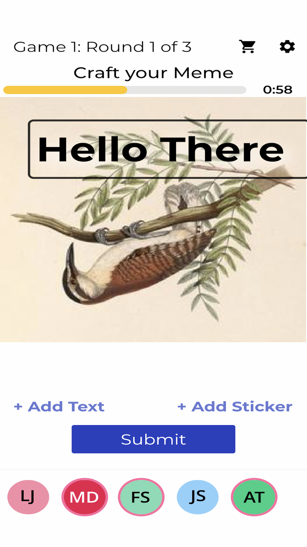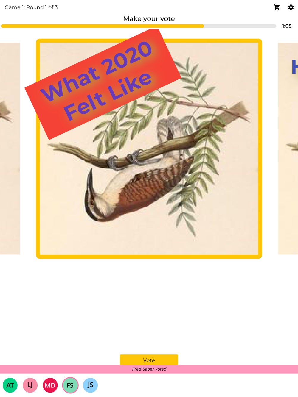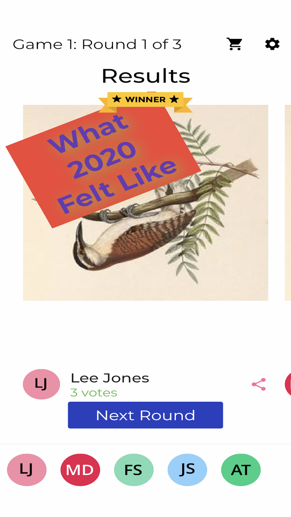 At the end of each round you will see everyone’s memes. Vote for the one you like best, score a point when someone votes for yours. Whoever has the most points after three rounds wins the Game!