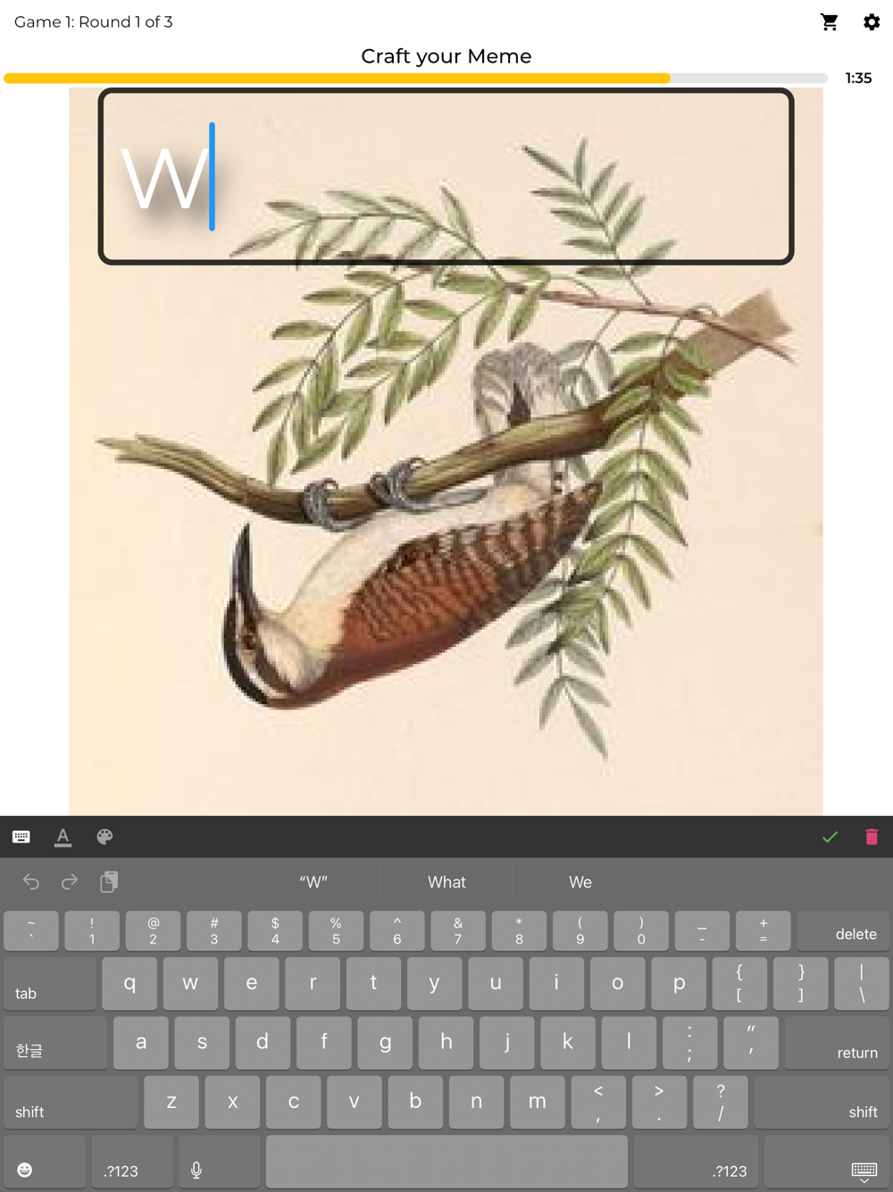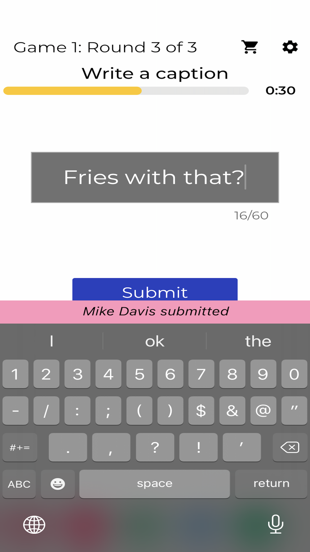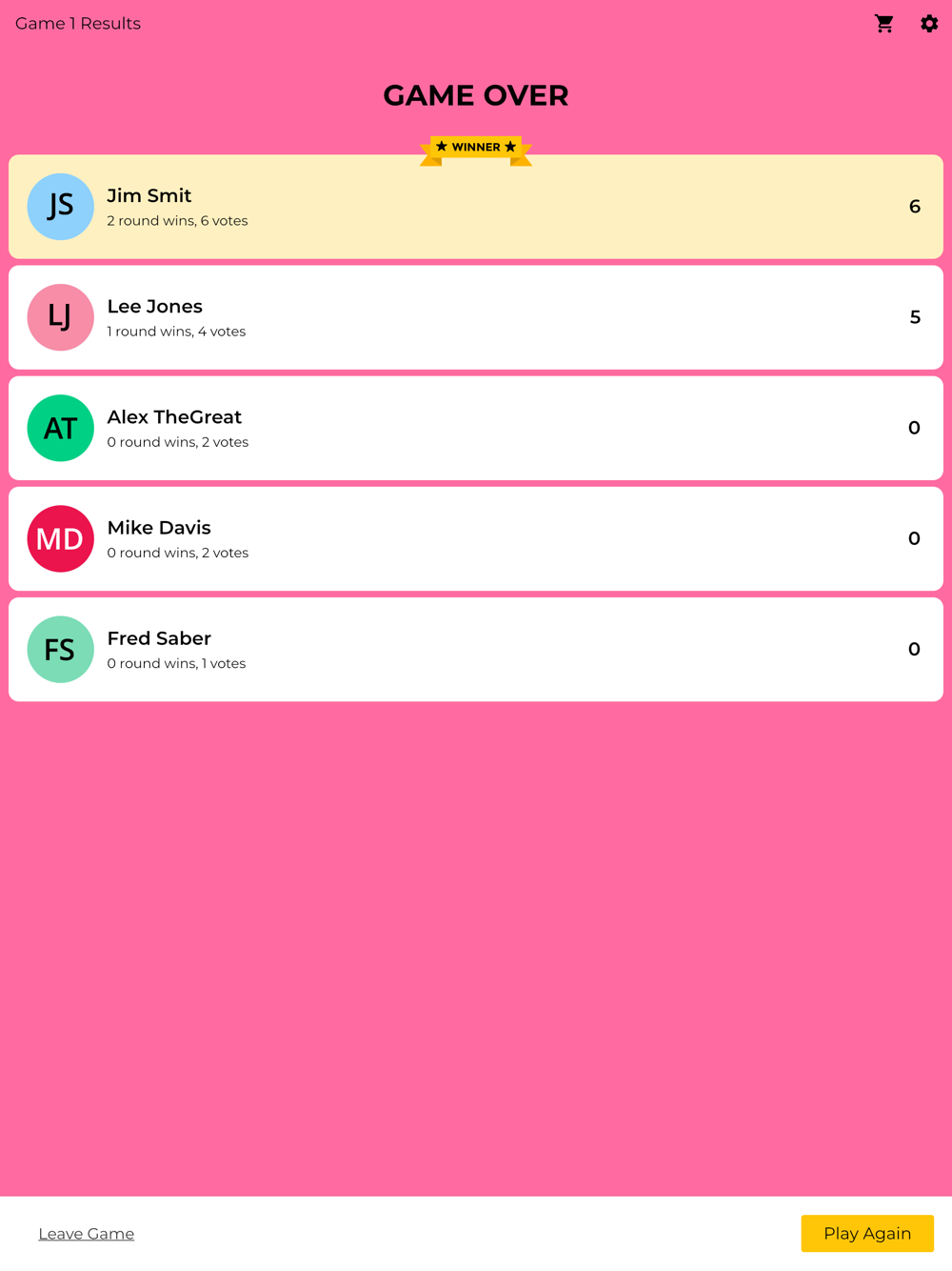 At the end of each round you will see everyone’s memes. Vote for the one you like best, score a point when someone votes for yours. Whoever has the most points after three rounds wins the Game!