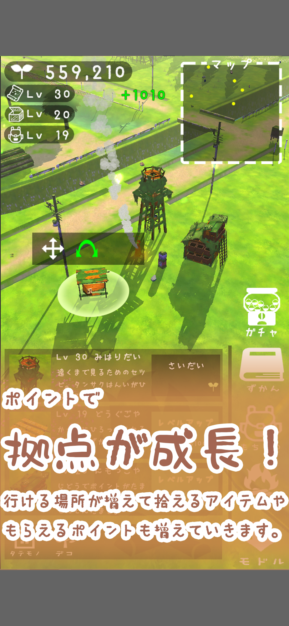 たまにタップしてタカラモノ(ガラクタ)を拾って、ポイントを集めて廃墟を成長させていきます。