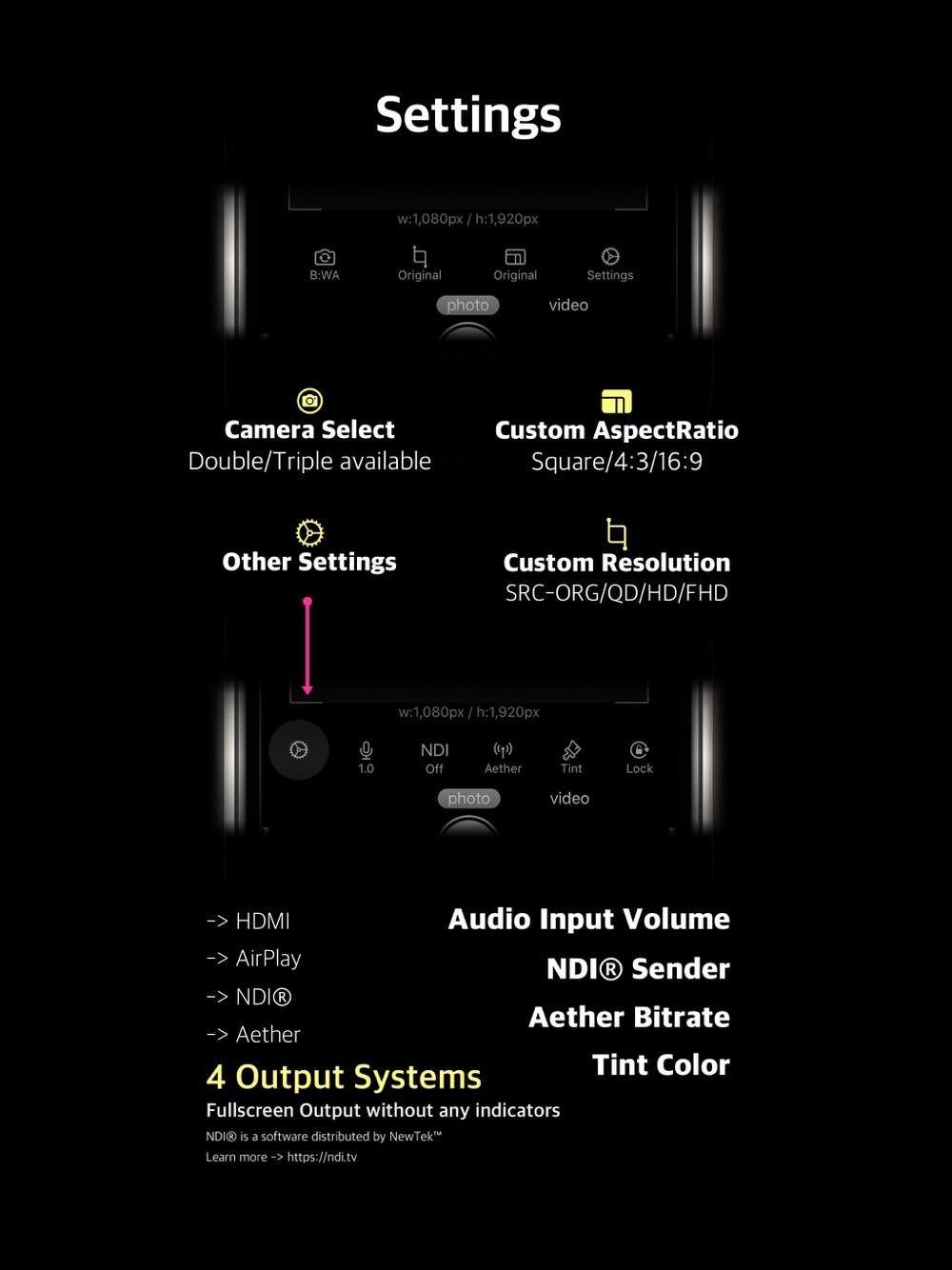 * 4 Aether is a low-latency, lightweight original IP video communication framework. It can be sent to Mac via wireless or wired connection and connected to Siphon for use in various applications.
