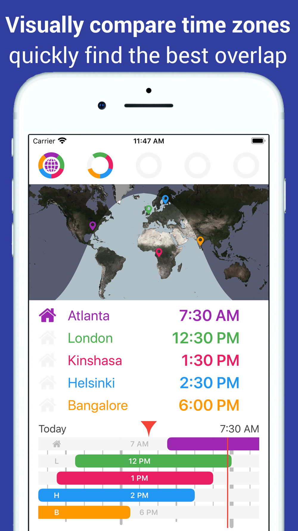 • Instantly see which hours overlap between your location and up to four places elsewhere on the world.