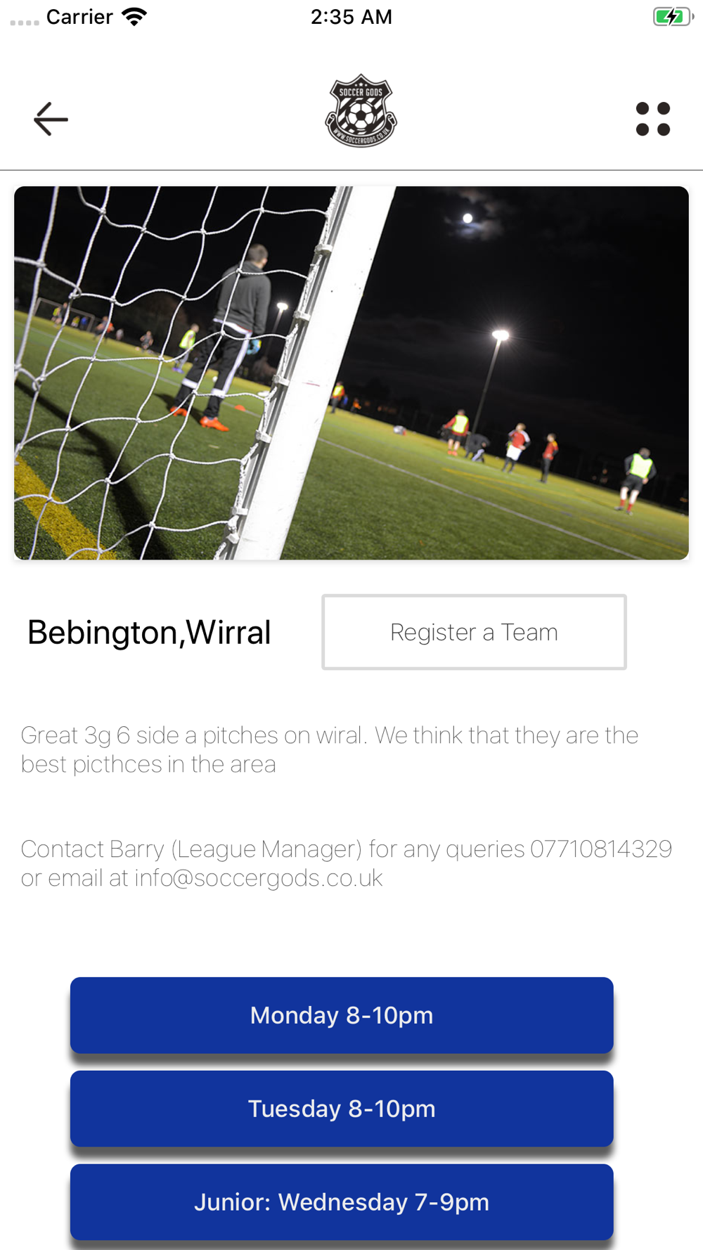 The Soccergods mobile app provides football players to register with FA affiliated leagues or join in as a complete team. This app also provides details of the leagues as well their upcoming matches, fixtures and points tables.