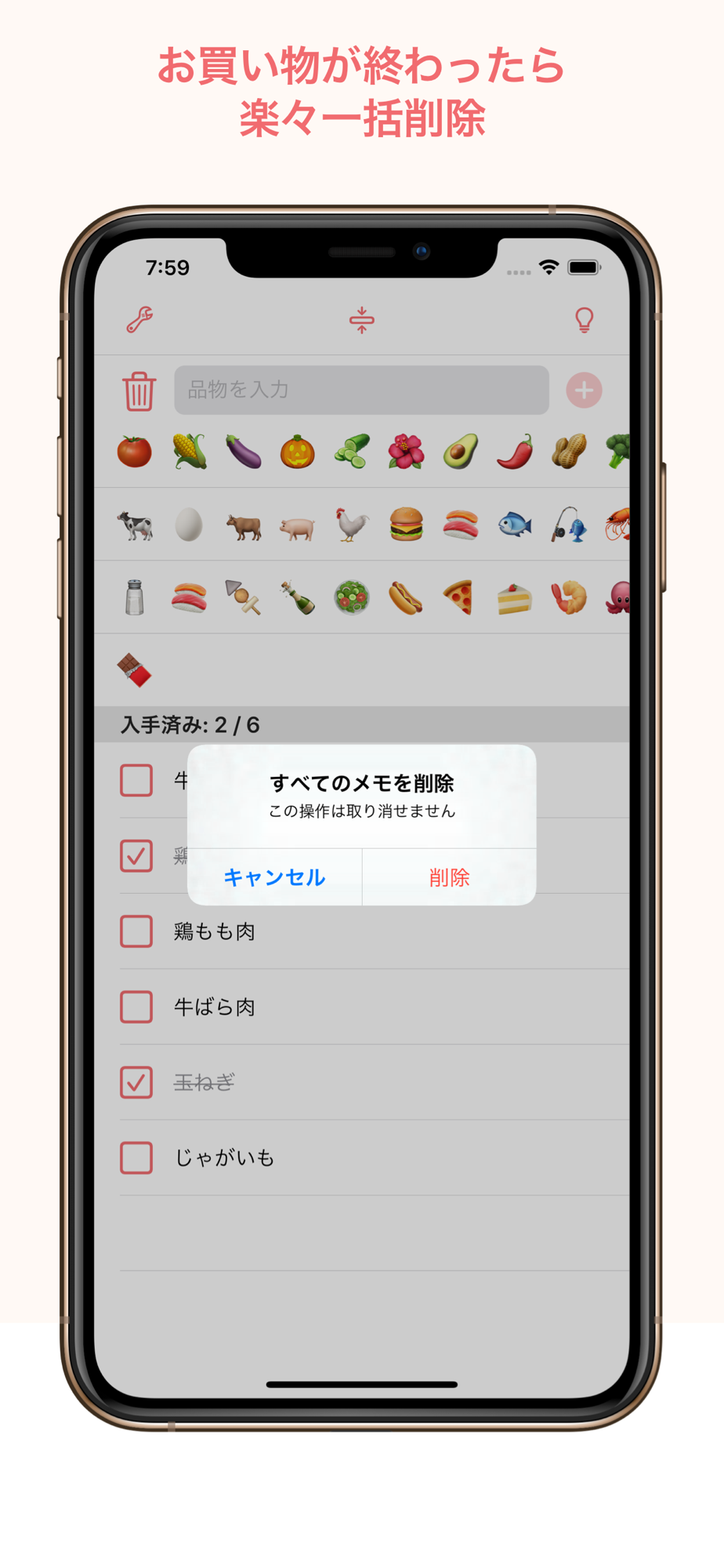 アプリ画面の上部には、品物を表す絵文字がたくさん整列しています。