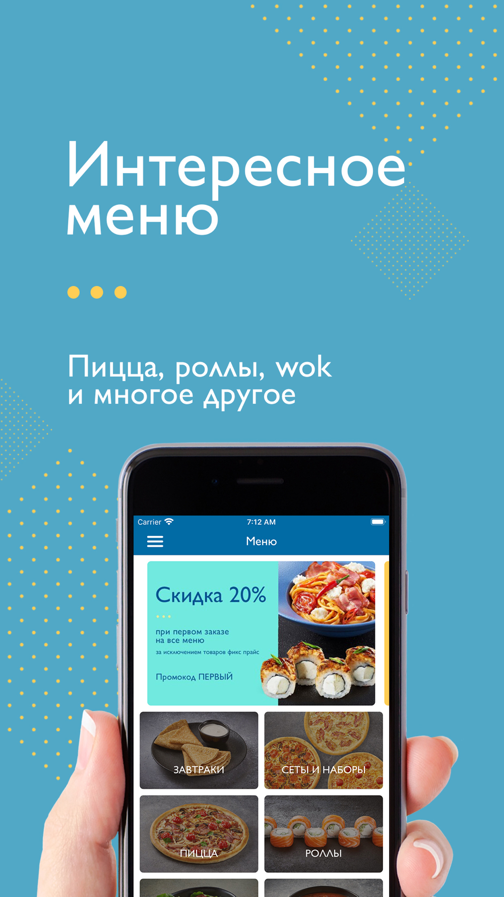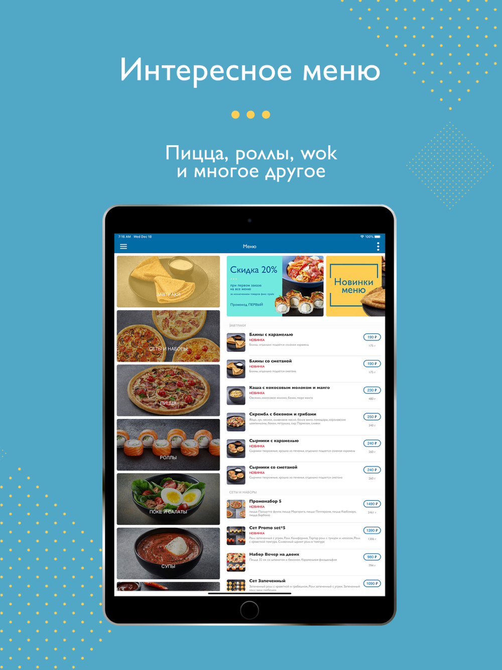 - Промонаборы и сеты: наборы пицц, роллов и др. блюд для больших и уютных компаний, празднований по специальным выгодным ценам.