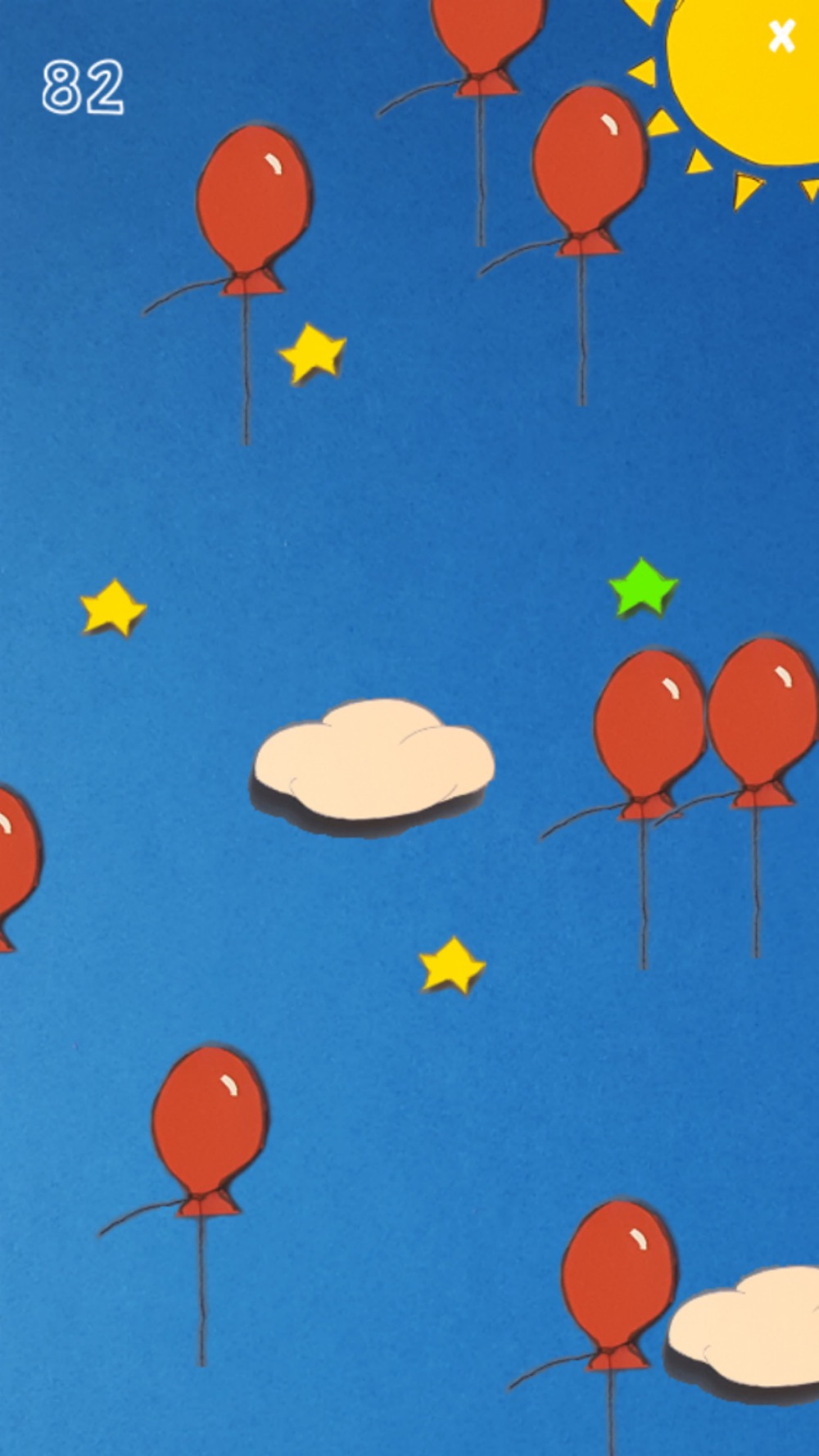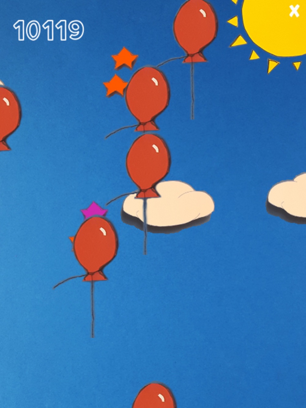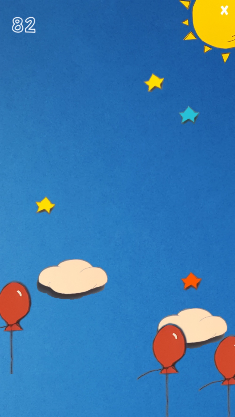 The stars will bounce off the clouds or balloons and you have to catch them, by taping on them. The balloons will go faster and faster to provide a bit of challenge. There is a balloon pop counter on the left, each pop counts as +1, each ballon that escapes counts as -1.