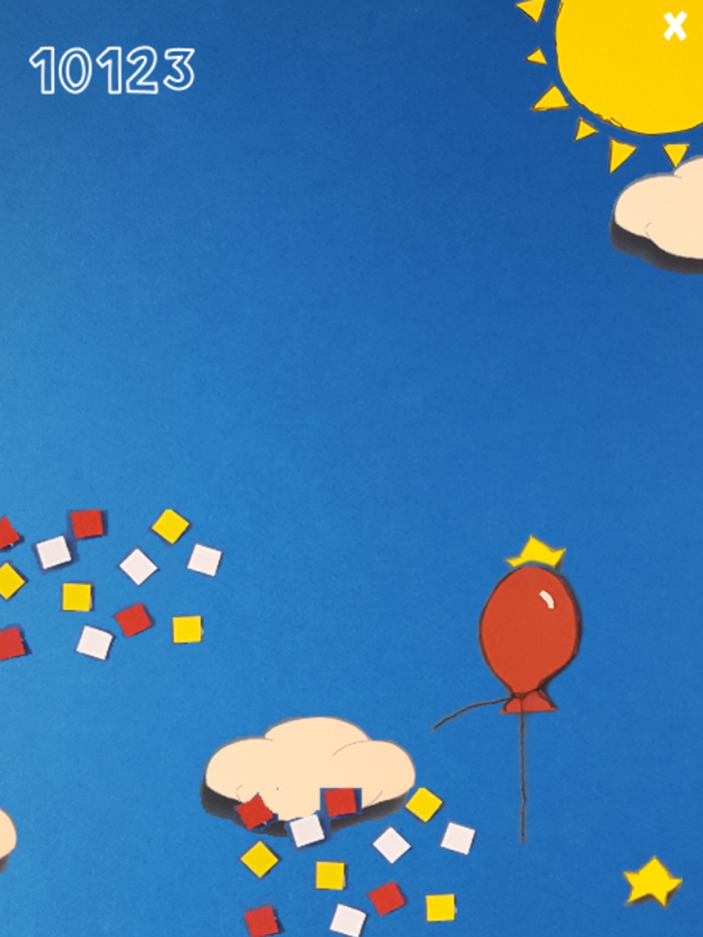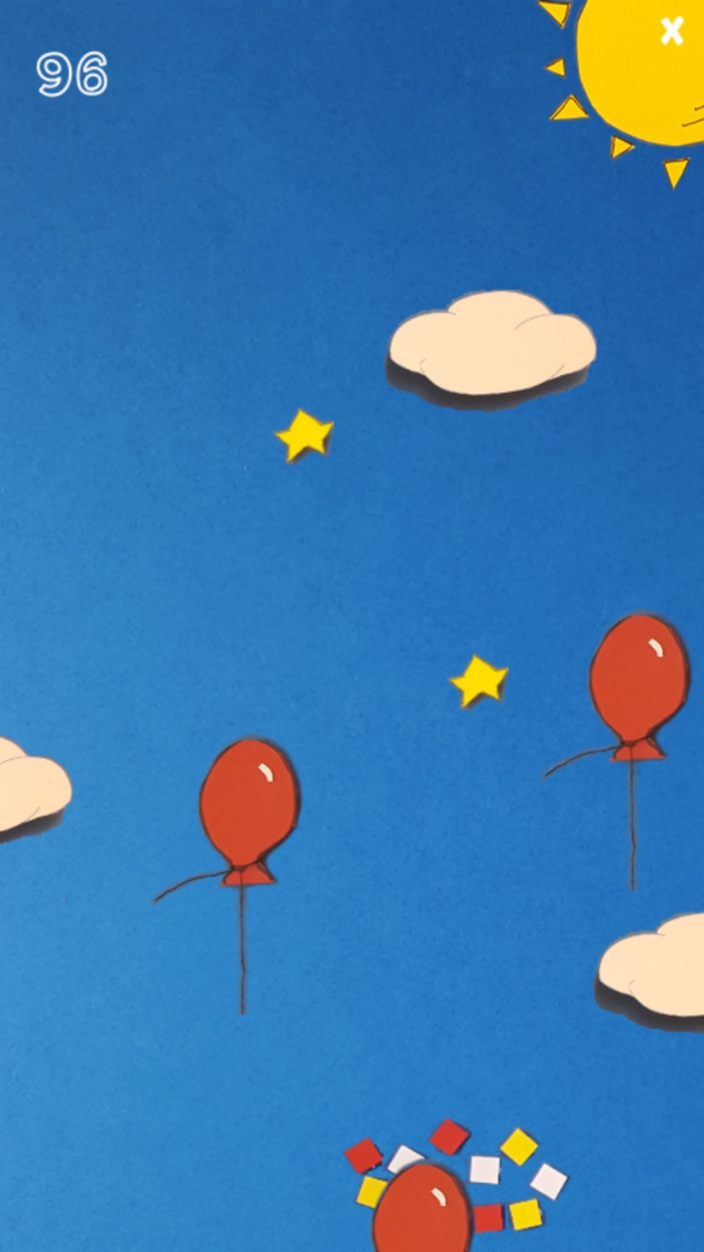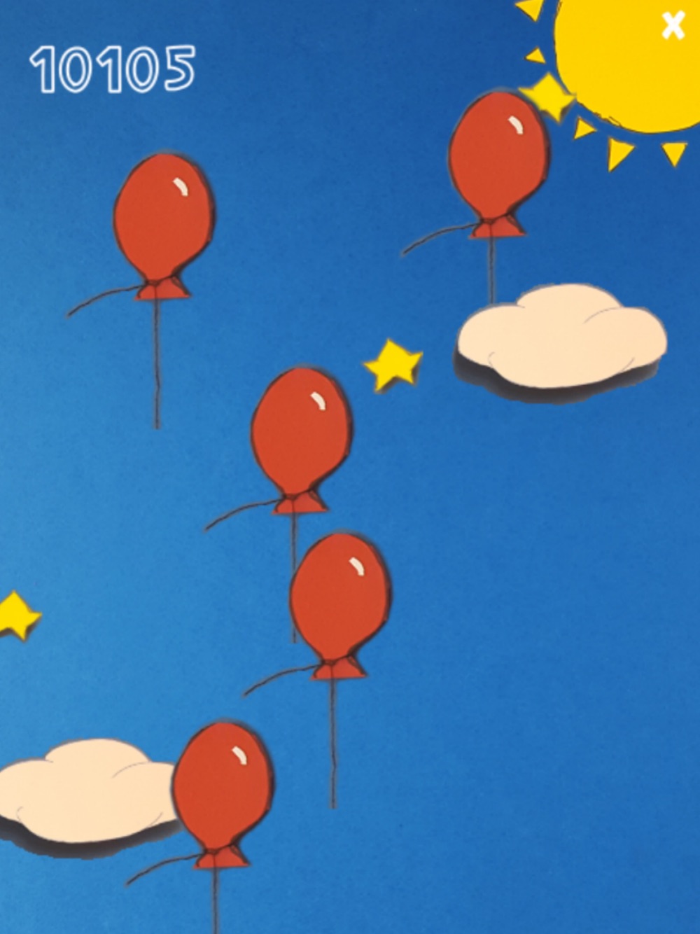 The stars will bounce off the clouds or balloons and you have to catch them, by taping on them. The balloons will go faster and faster to provide a bit of challenge. There is a balloon pop counter on the left, each pop counts as +1, each ballon that escapes counts as -1.