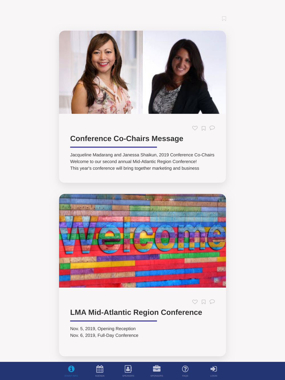 Welcome to the LMA Mid Atlantic 2019 Conference app! Event Info will list information about the event and our venue. The agenda page will allow you to see sessions' locations and speakers and create a personalized agenda. The speakers and sponsors list will allow you to see more information. FAQs will have simple answers to common questions about the event.