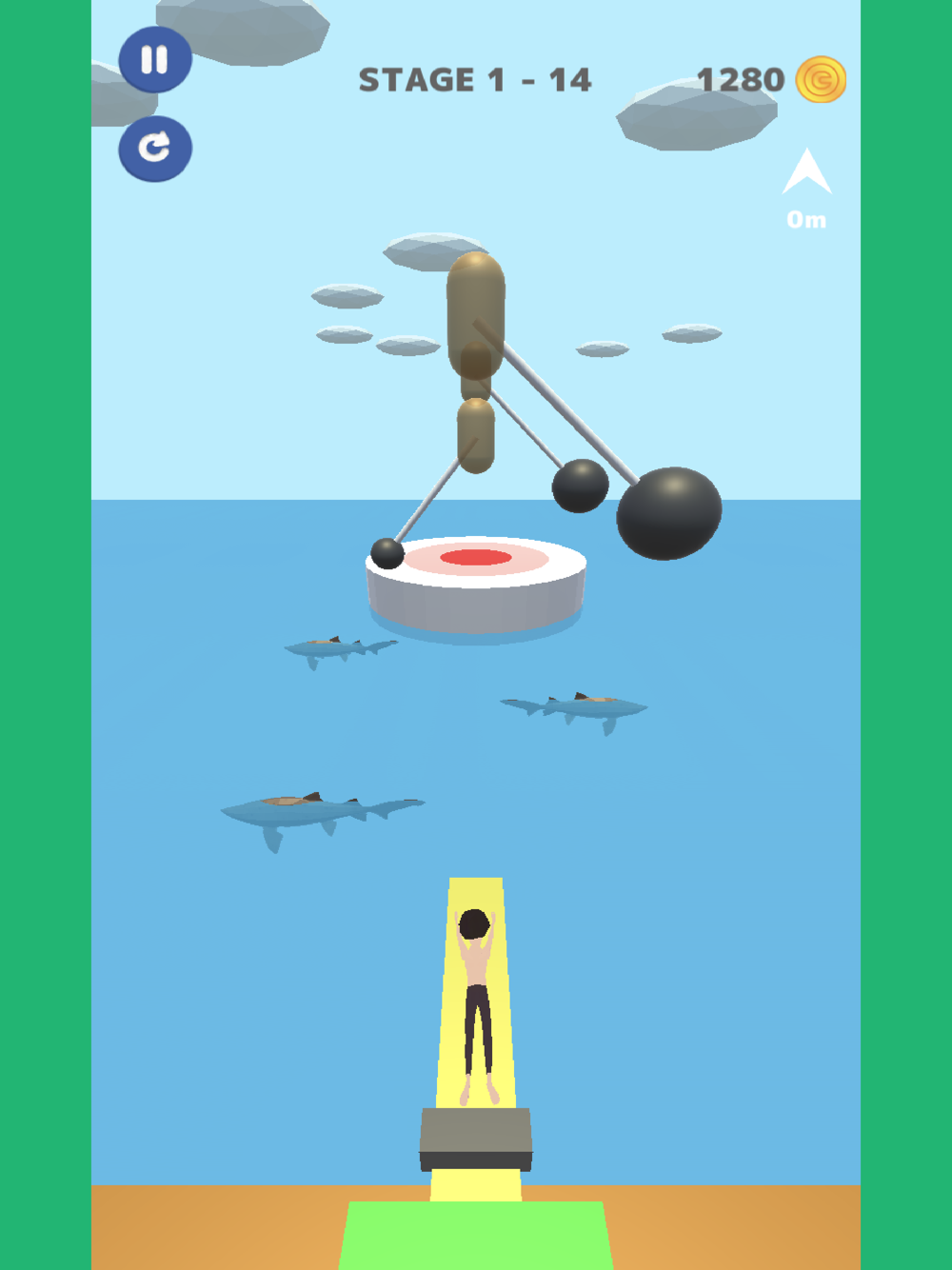 Jump to safety zone so that you escape from the danger island around which many sharks swim.