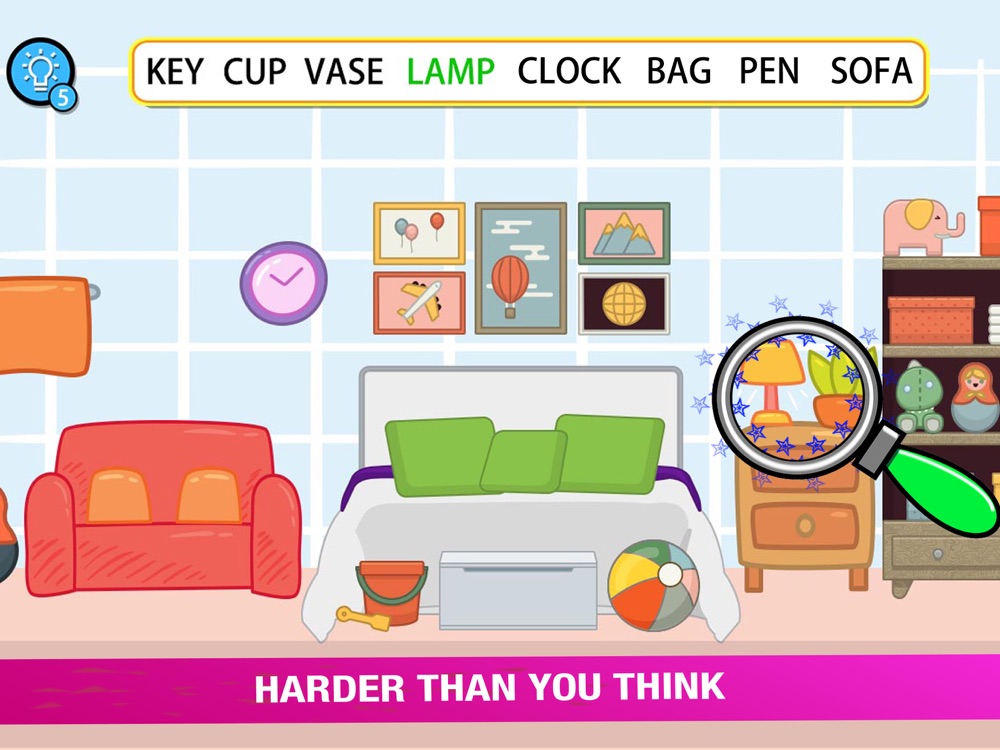 最適合每個年齡段的孩子,女孩,男孩和成人。還可以增強視覺詞彙修飾和學習新單詞。最好的假期遊戲,可以測試您的記憶力和偵探能力,並通過查找對象列表為您的大腦提供最佳的日常鍛煉。在謎題和冒險中度過您的空閒時間,並在此益智遊戲中享受很多娛樂。
