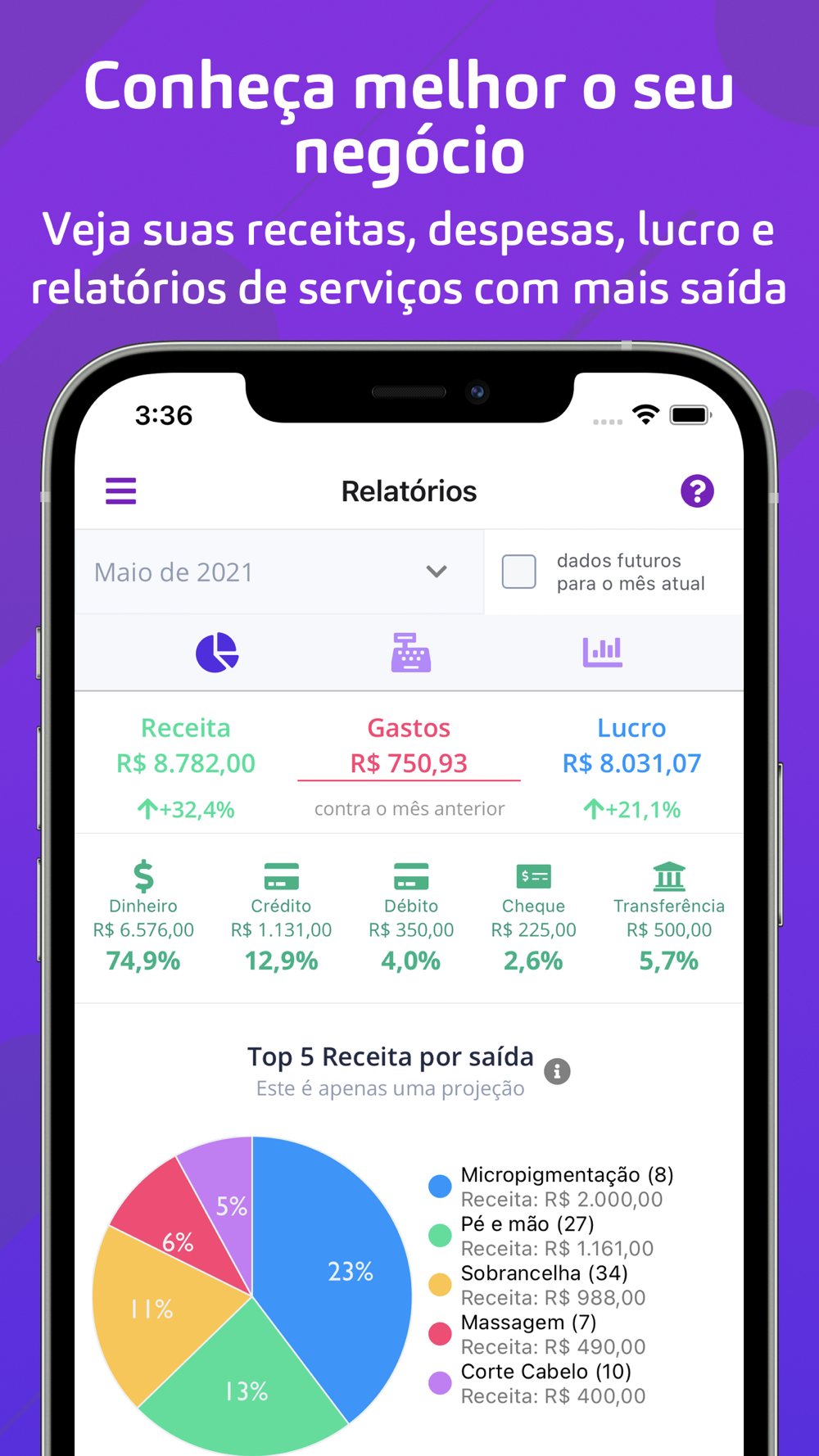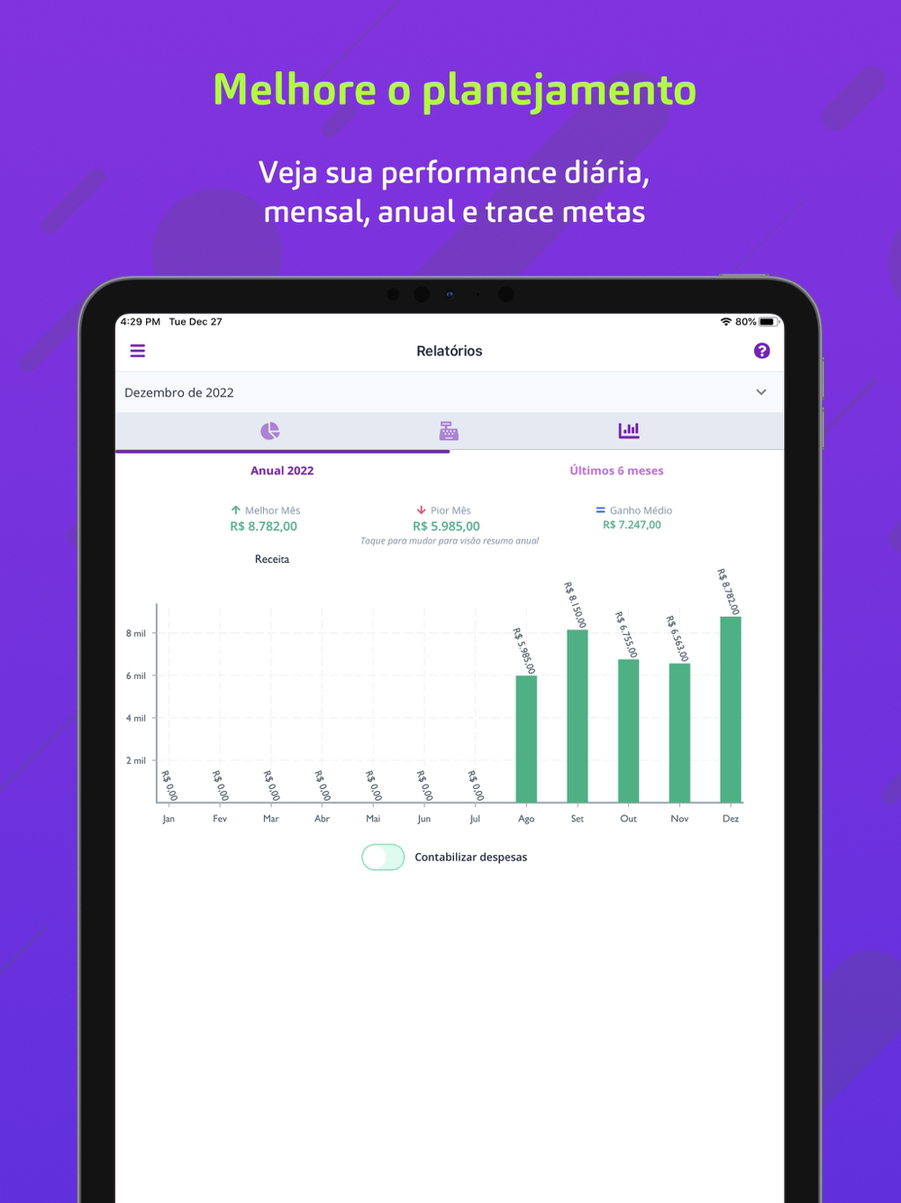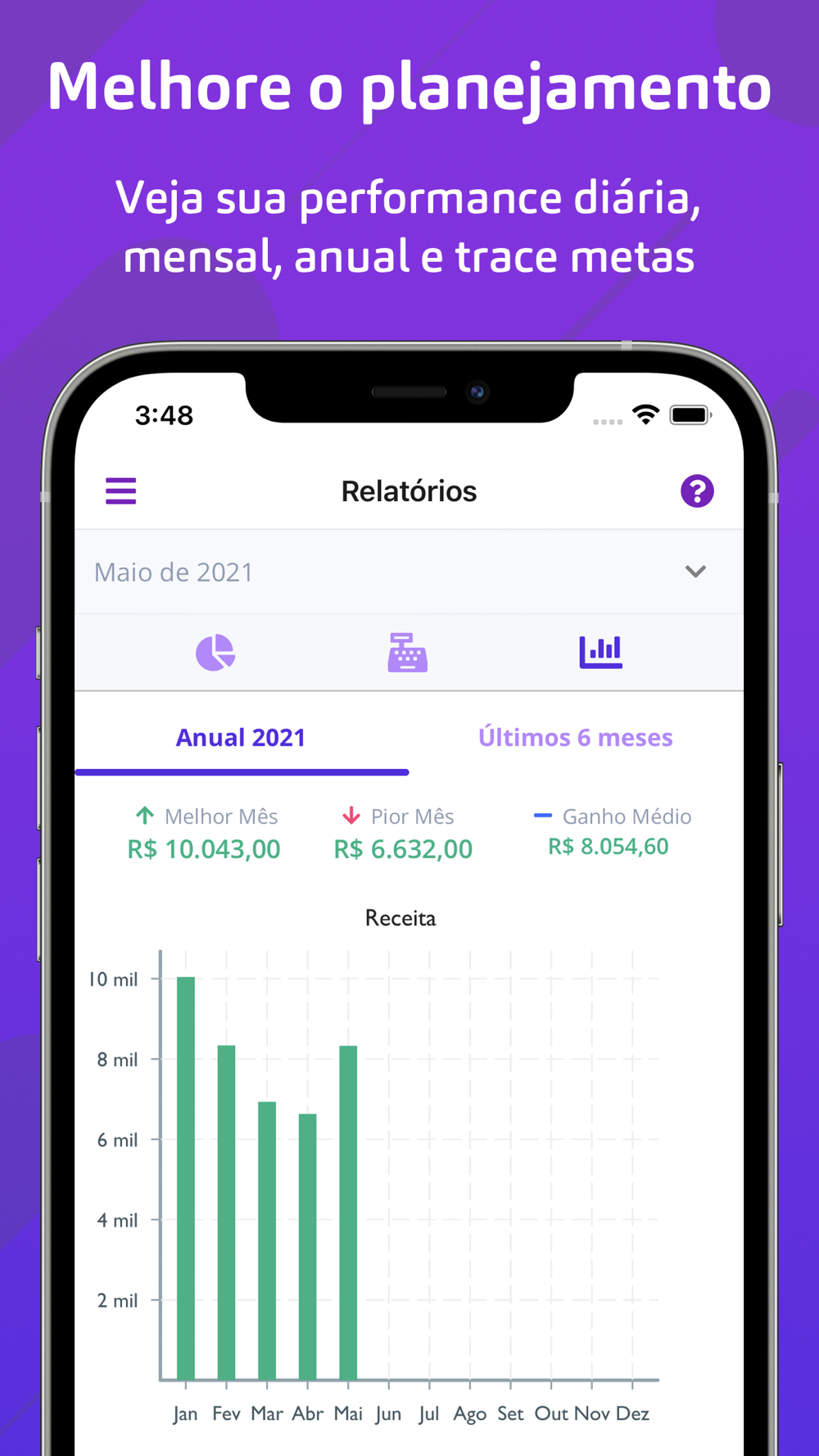 Veja sua receita, despesas, e lucro; Tenha controle do que entra no seu caixa; Veja sua performance diária, mensal, anual; Trace metas;