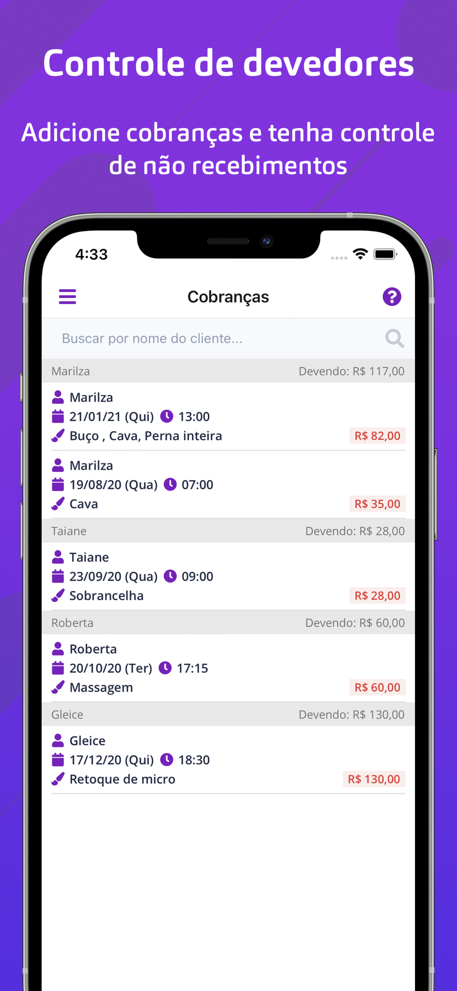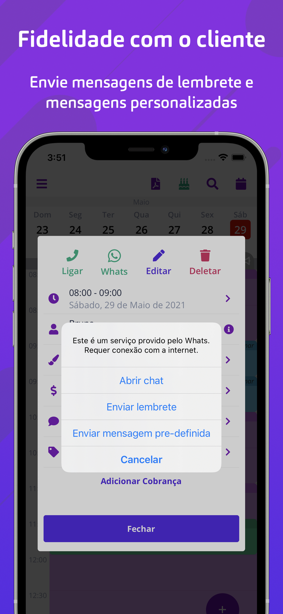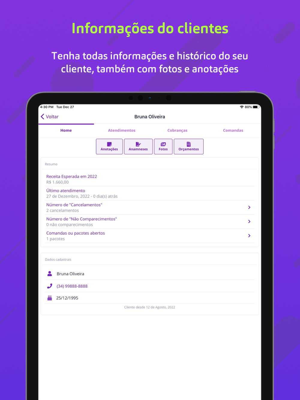 Suas funcionalidades de destaque são agenda eletrônica, integração com WhatsApp para acessar clientes e enviar mensagens, relatórios financeiros e de performance.