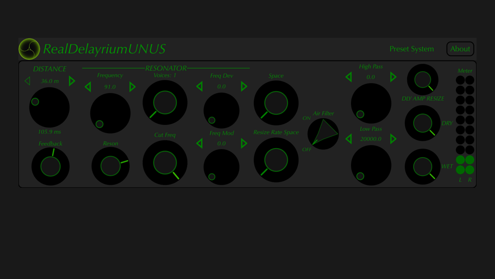 RealDelayrium is a MultiDelay Audio Units PlugIn in parallel approach. It is based on 6 delay line with controls in Time, Feedback, Reson Filter, Frequency Modulation, LowPass, HighPass and Air Filter.