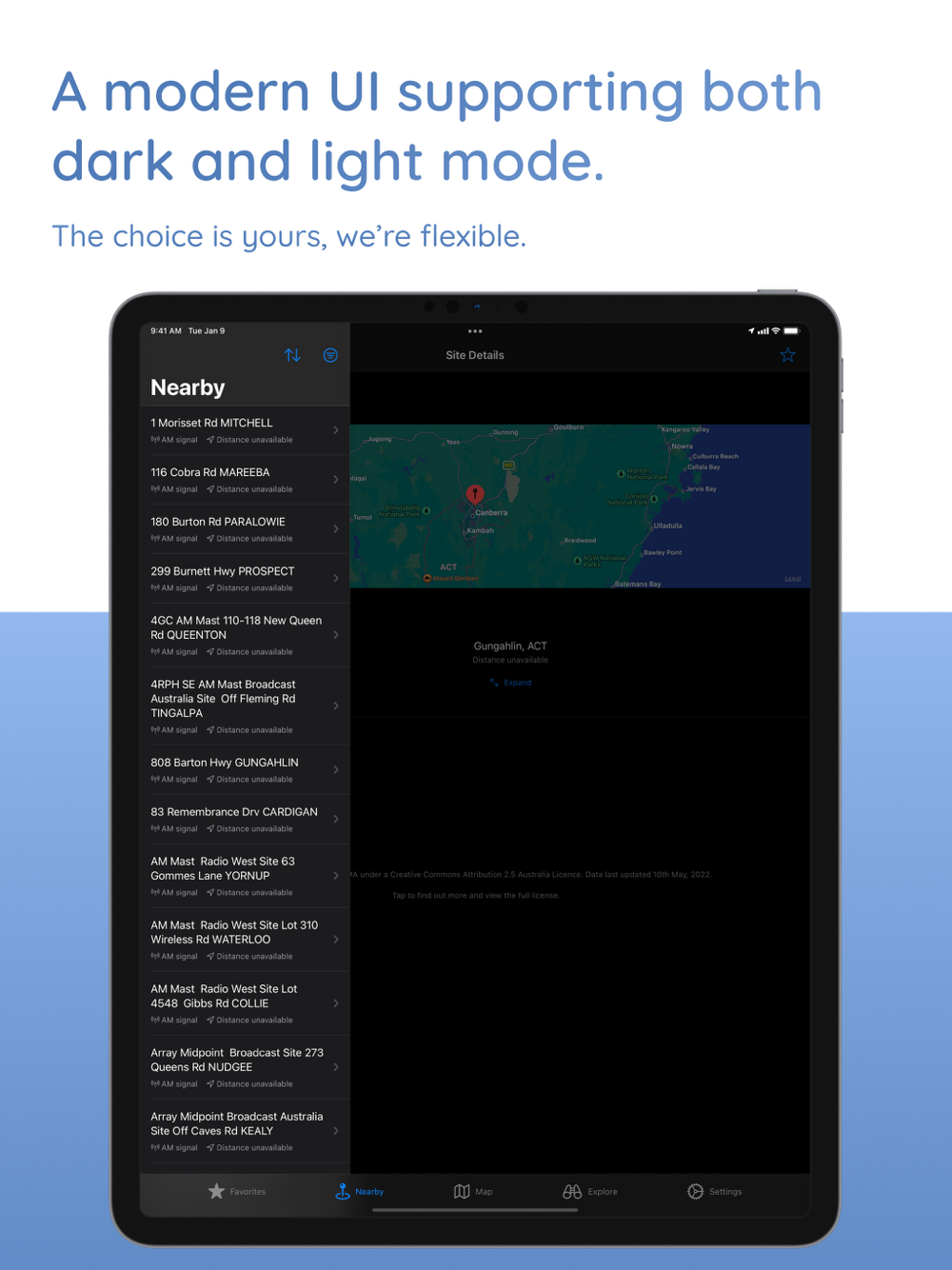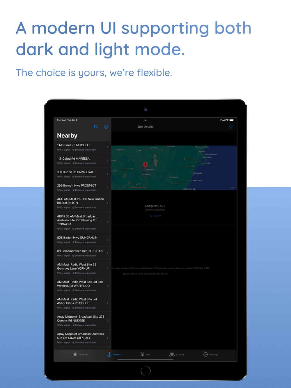 The app works with both light and dark mode, ensuring a smooth experience for those seeing to find nearby transmitters.