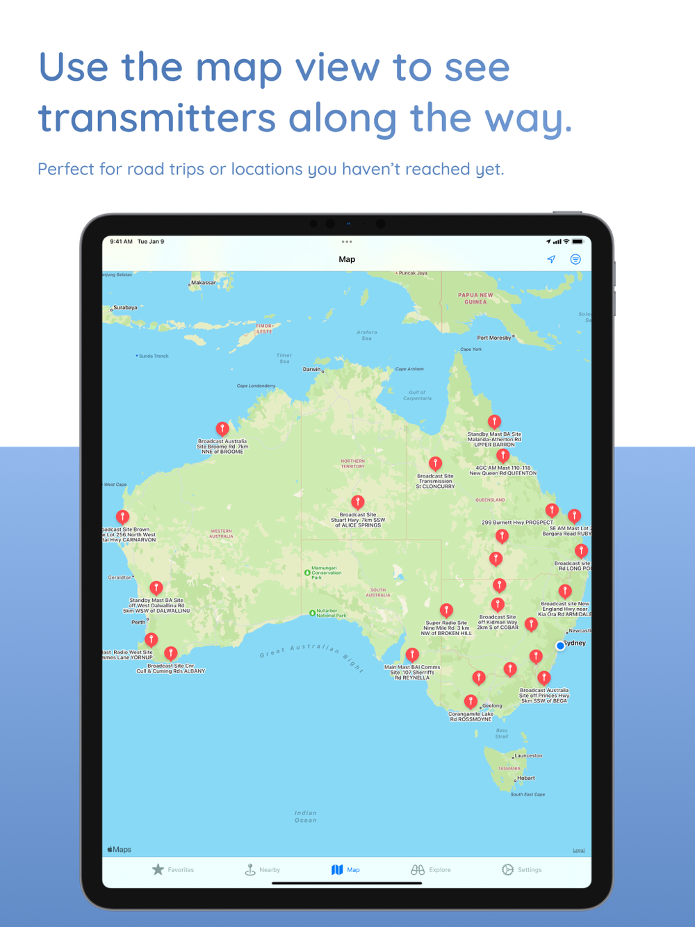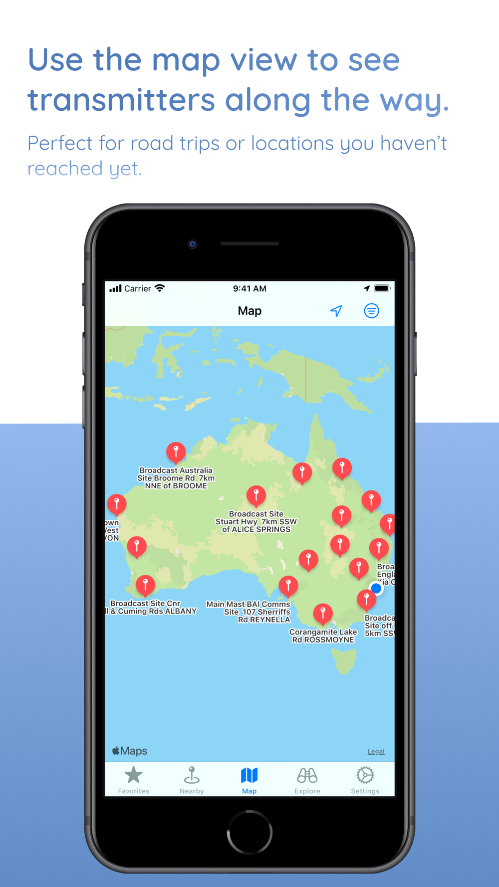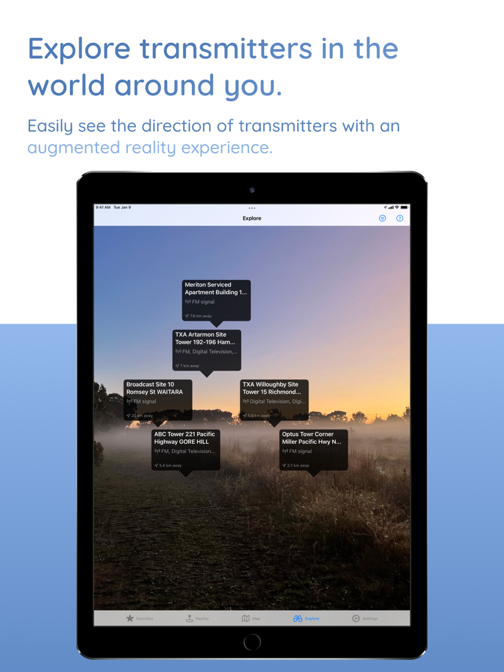 Enter the Explore tab, and see nearby transmitter sites overlaid on the world around you. Filter them so you only see the types (AM, FM, Digital Radio or Digital Television) you're interested in, and show sites within 25km, 50 or 100km of your location.
